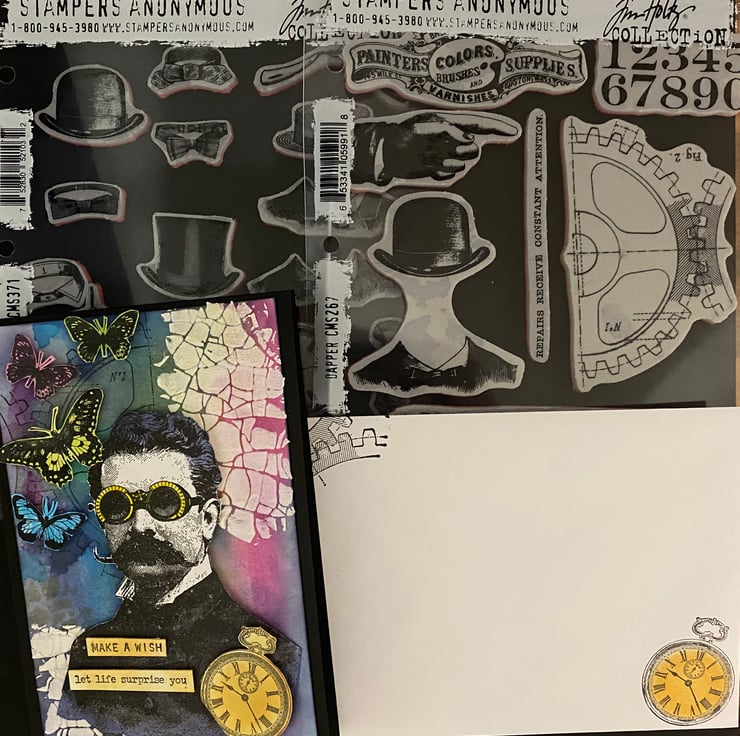 This card also features other Tim Holtz stampsets: Tiny Text, Dapper, Distinguished, Crazy Talk