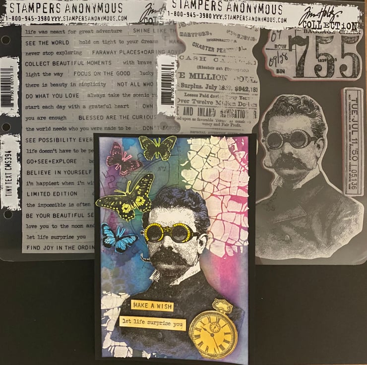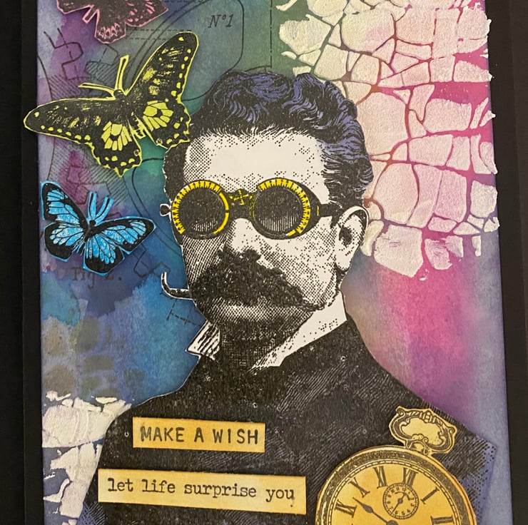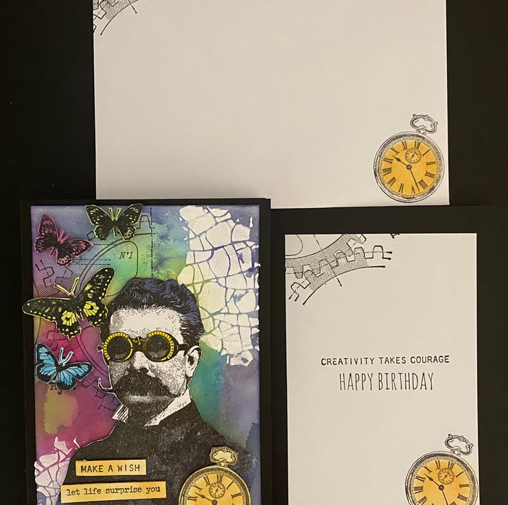 The Professor was stamped, heat embossed fussy-cut, before colouring using a yellow sharpie for his glasses and Distress Oxide in Chipped Sapphire for his jacket. Texture grit paste was added. The pocket watch was stamped and embossed in gold. This card has 4 butterflies; stamped, heat embossed, fussy-cut and coloured using the same colourscheme as the card background.