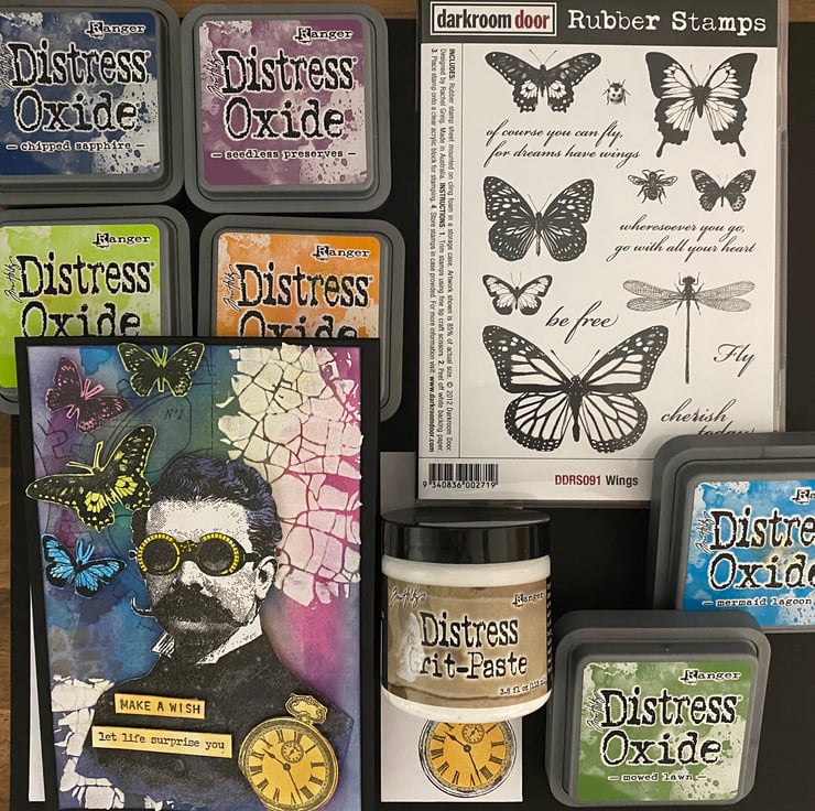 This is another steampunk-style card designed using the Tim Holtz stamp set called The Professor 2, but this time in collaboration with the Darkroom Door "Wings" stampset and the "Crackle" stencil.