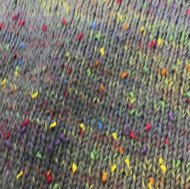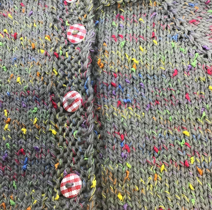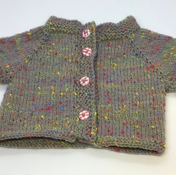 This cute cardigan is made in a premium quality acrylic yarn (sirdar) in grey with multicoloured flecks, and contrasting red buttons. It will fit a baby up to 6 months old approximately. Chest 21”. Hand knit in Lancashire. Pattern credit Louise Tilbrook.