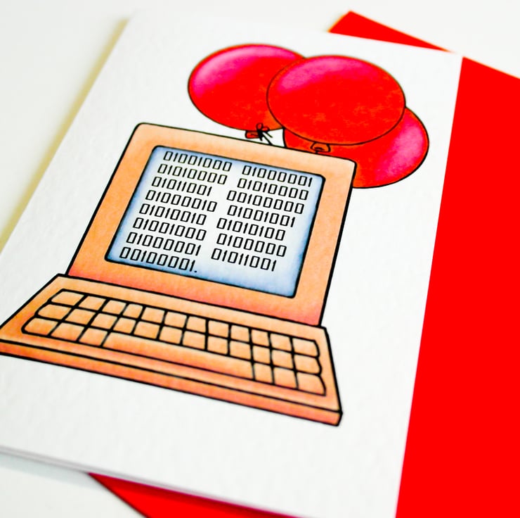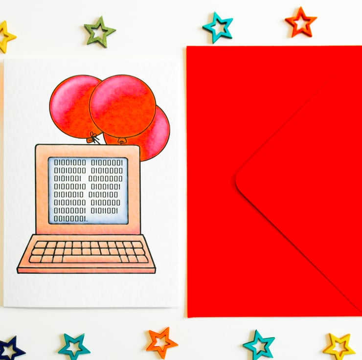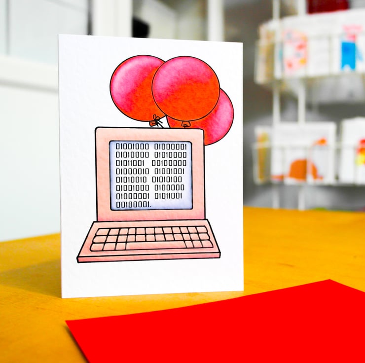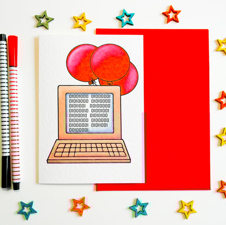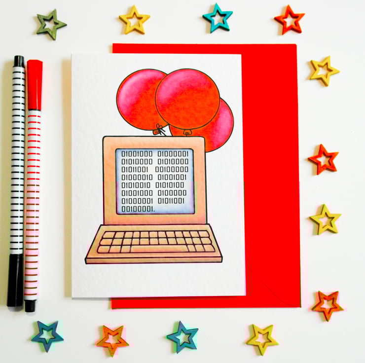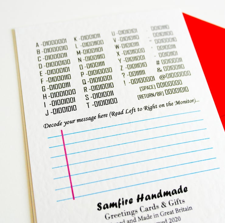 A Binary code birthday card to send to the computer nerd. programmers, coders or puzzle lover. Figure out the message using the Binary code given on the back, there is even a lined area for you just to do that.