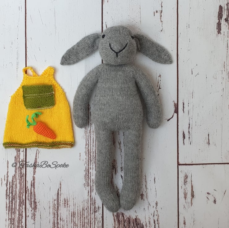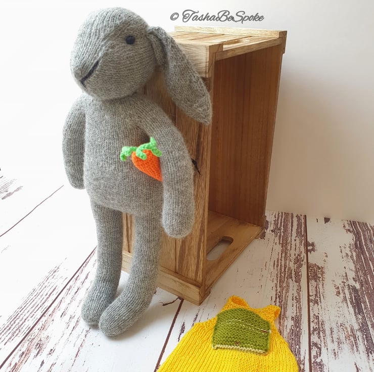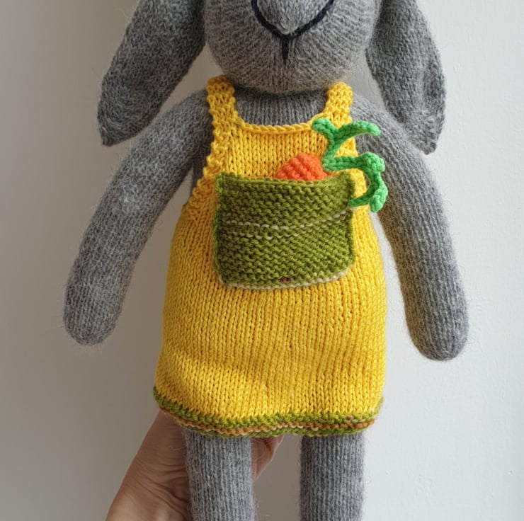 Molly is hand knitted from pure alpaca yarn and love :)). She has a lovely yellow cotton sundress with a little pocket to keep her carrot safe. She will make a nice decoration for the nursery room or the girl's bedroom.