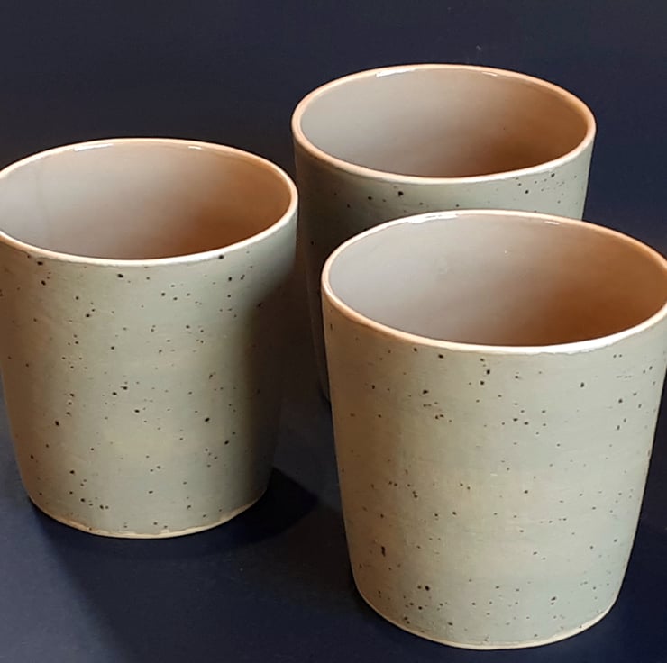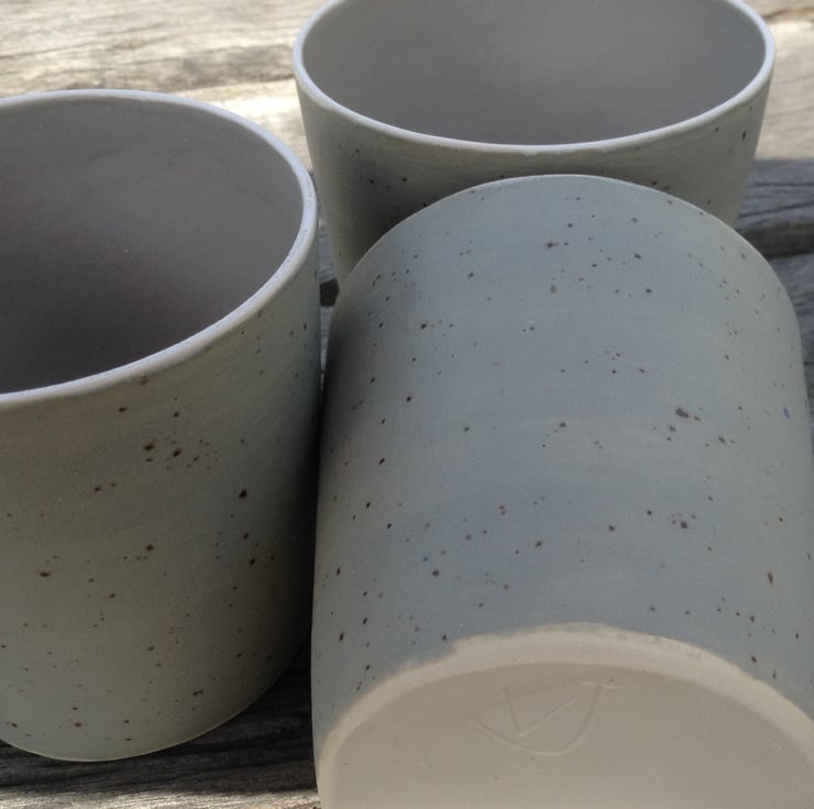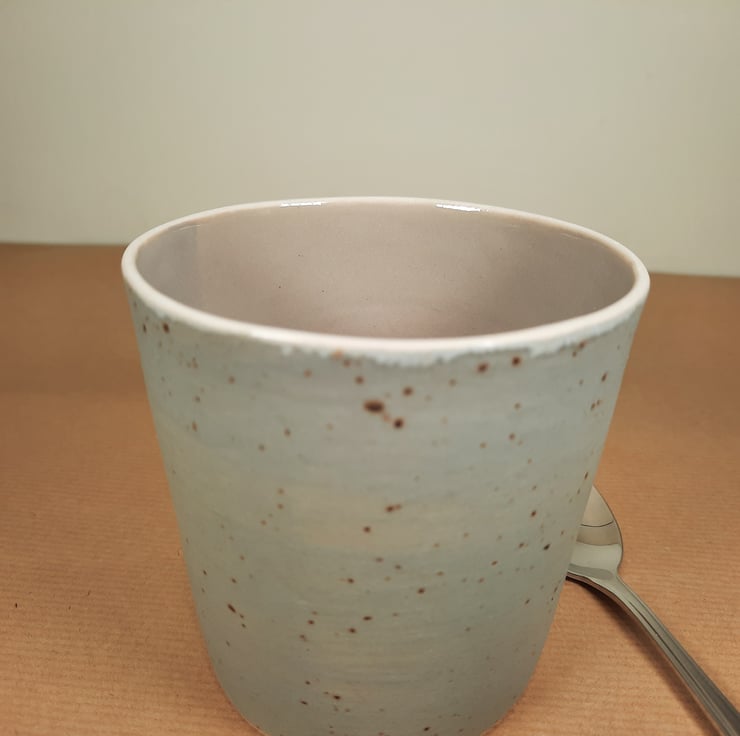 Hand thrown stoneware mug with no handle. The mug has a taupe grey glossy inside glaze with a matt speckled grey glaze on the outside. These are big fat mugs for a large cuppa!