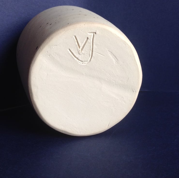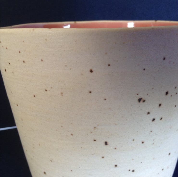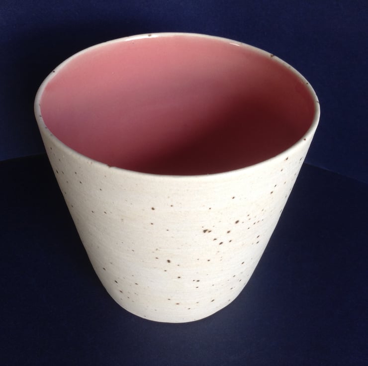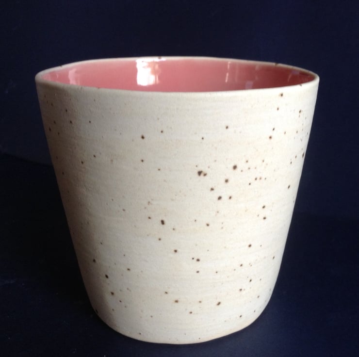 Hand thrown stoneware mug with no handle. A deep pink glossy glaze interior and a speckled cream matt glaze exterior
