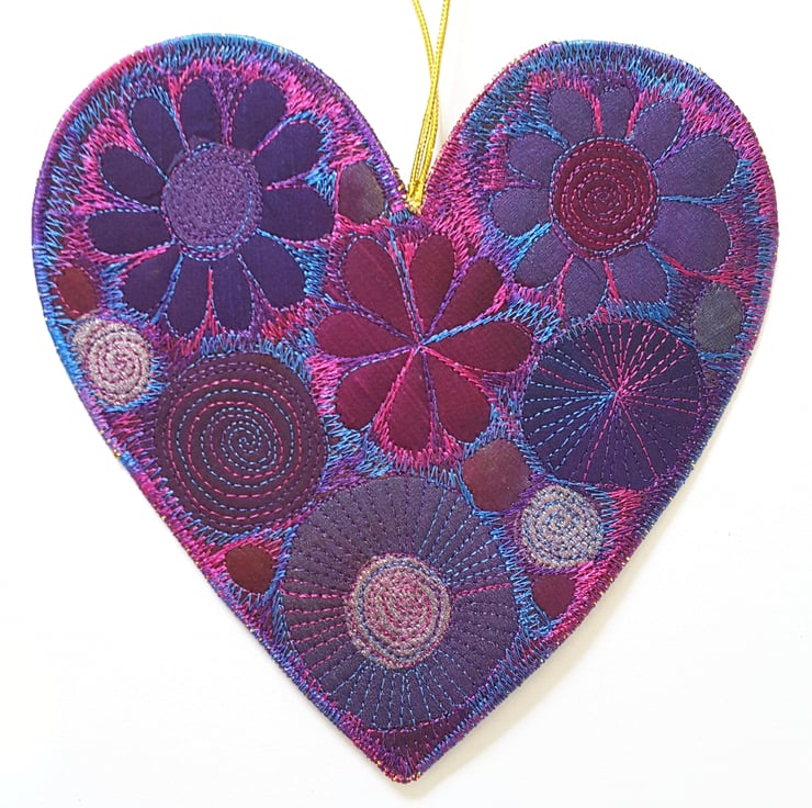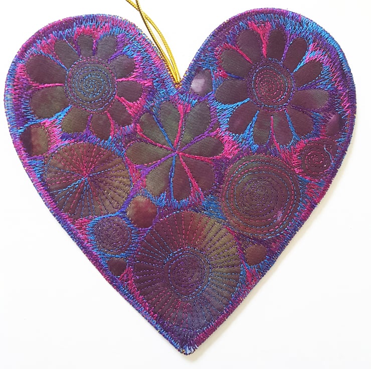 Made from layers of fabric including hand dyed Egyptian cotton and silk fabrics using the free machine embroidery style of sewing
