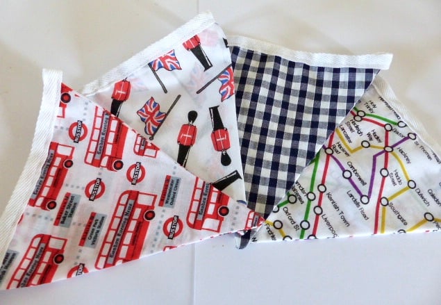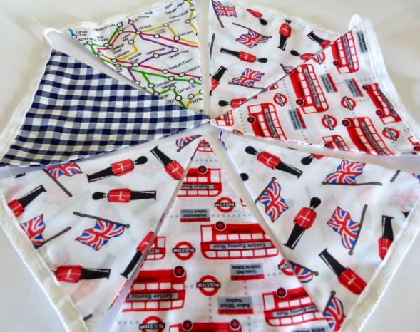 This double sided bunting is made with poly cotton fabrics with a London theme. It measures approximately 3 metres in length, has 13 flags each measuring 17cm wide by 19cm in length and has a length of tape at each end for tying. This bunting would suit a childs bedroom or playroom or could be used in the garden in dry weather. The number of designs of the flags are as follows: 6 x Guards; 2 x Blue Check; 3 x London Bus and 2 x London Underground.