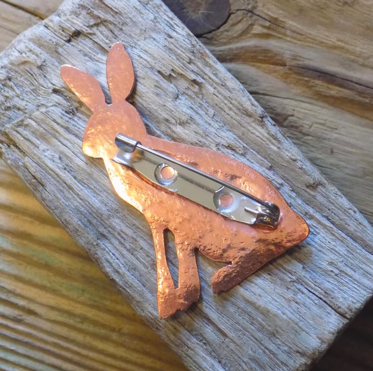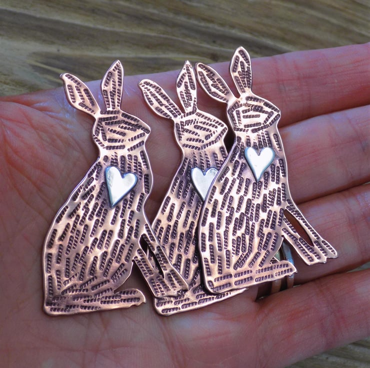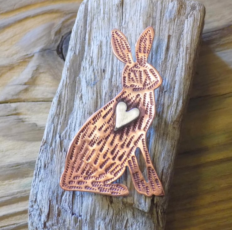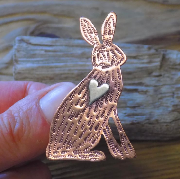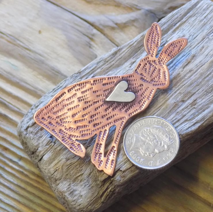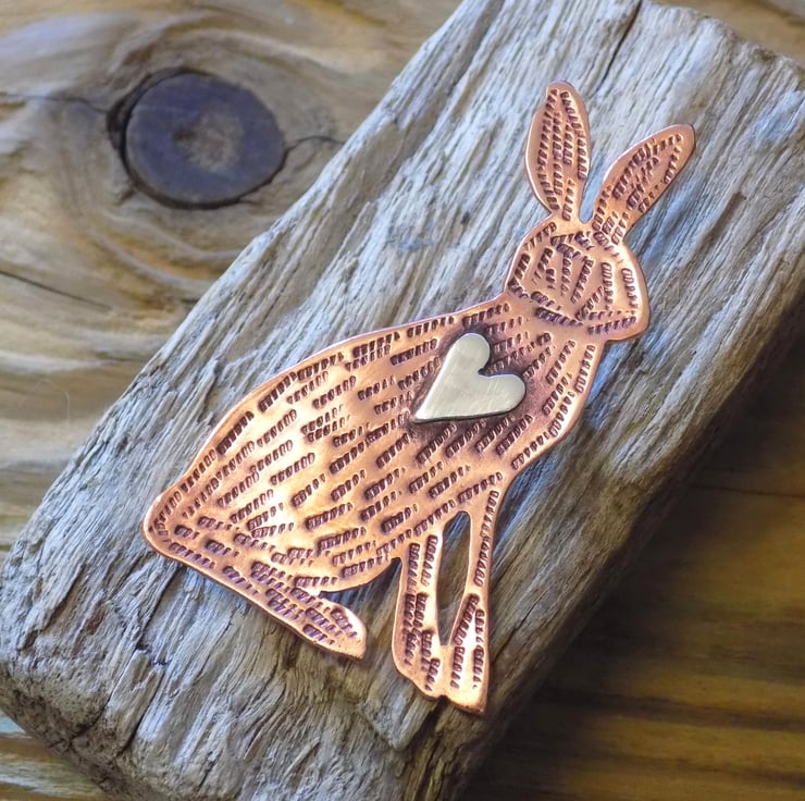 Designed and hand sawn from 1mm thick copper sheet. Each textured stroke has been stamped onto the copper to create the hares coat and a sterling silver heart has been soldered to the front. The whole brooch has been given an aged effect which picks out all the detail and texture creating a lovely contrast between the silver and copper. A sturdy brooch setting has been fixed to the back with very strong jewellers glue.