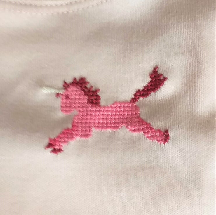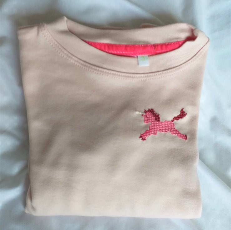 I recently decided to try a new venture, and hand embroider long sleeved T-shirts. This little unicorn has been popular with girls for a while now.
