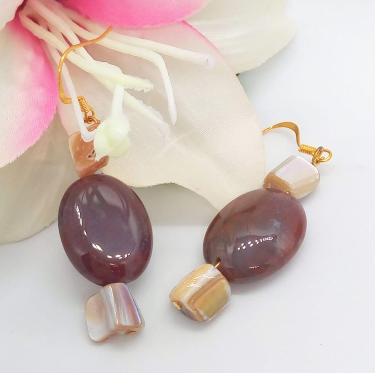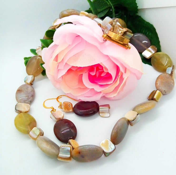 Beautiful Bundle, Brown Grey and Yellow Agate and Shell Bead Jewellery Set, Necklace, Earrings, Accessories, Birthday Gift, Agate Jewellery, Anniversary Gift, Gift for Her
