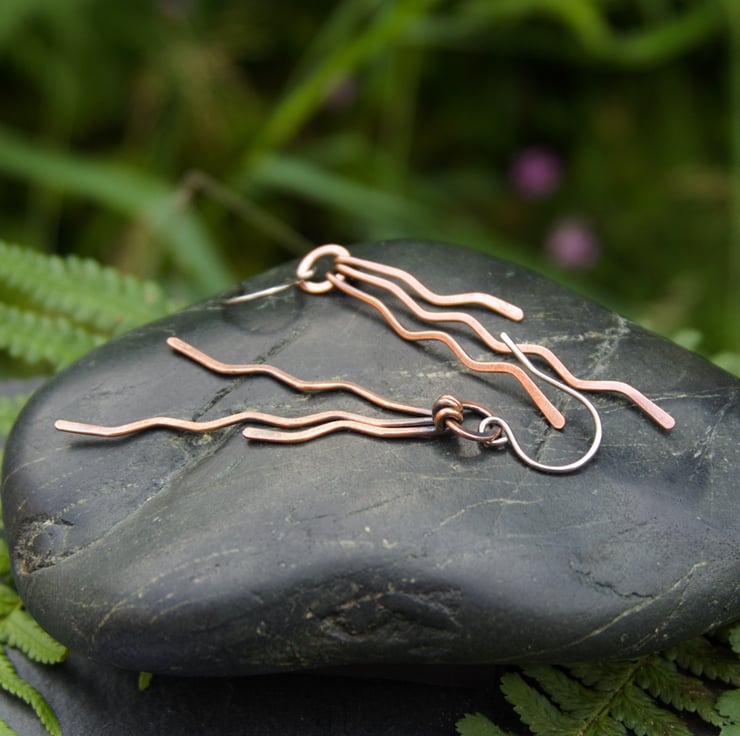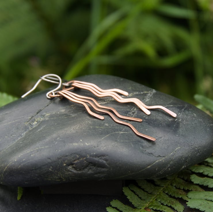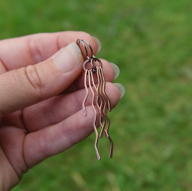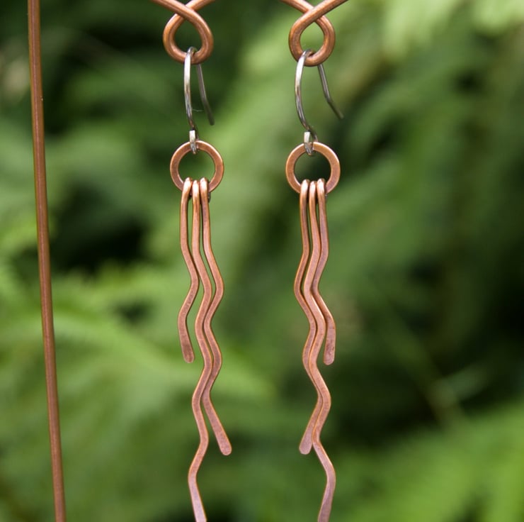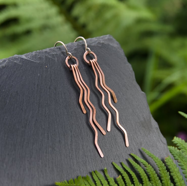 These gorgeous long dangle earrings have been entirely handmade from copper wire. Each earring has three separate zigzag dangles with staggered lengths, which have been hammered flat and then attached to a hammered ring. Each separate dangle can swing independently, creating a fun but stylish pair of earrings with a lot of movement (and a great noise as you move!)
