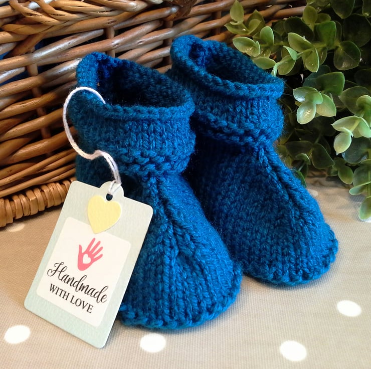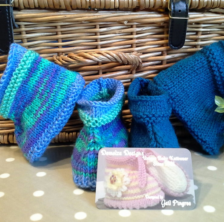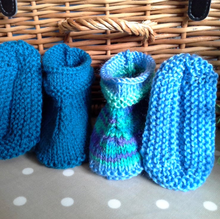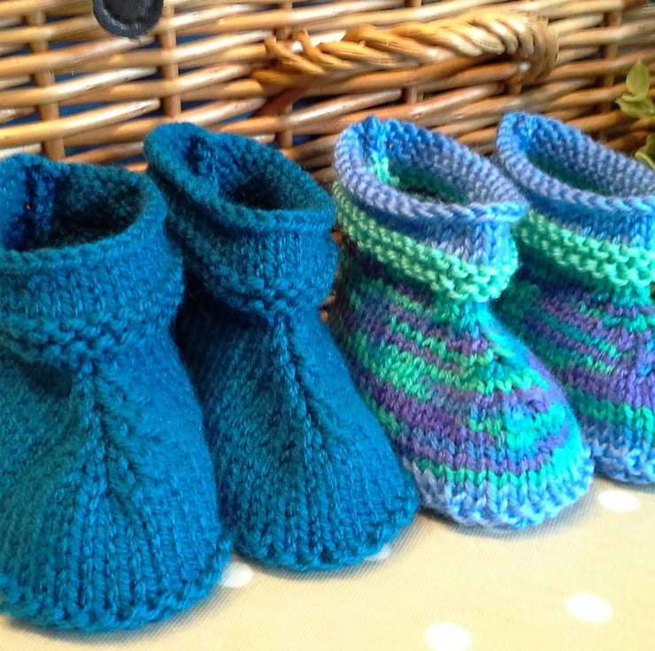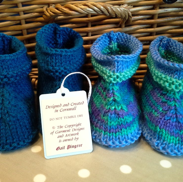 A practical two pair pack of booties for baby boys. They have been designed and hand crafted using premium branded British and French manufactured yarns. All yarns are machine washable at low temperature settings.