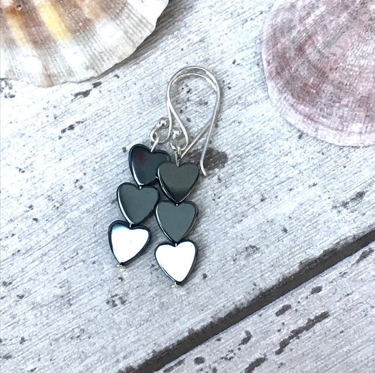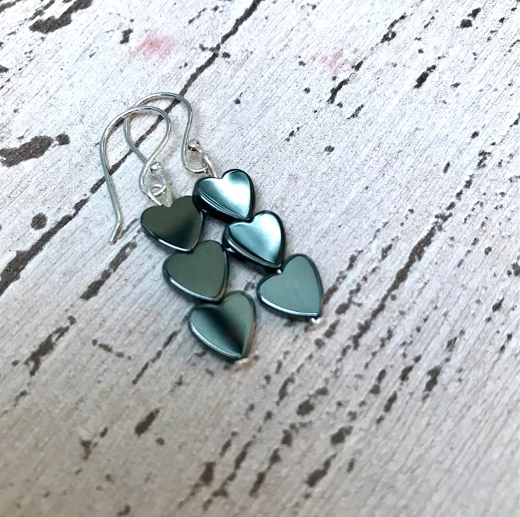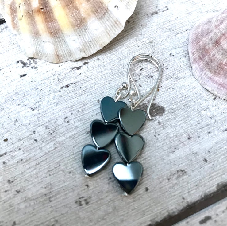 Stylish hematite. These are gorgeous earrings. A perfect gift idea too. A little thoughtful gift. 3 tiny heart beads make up this design. With silver plated ear wires.