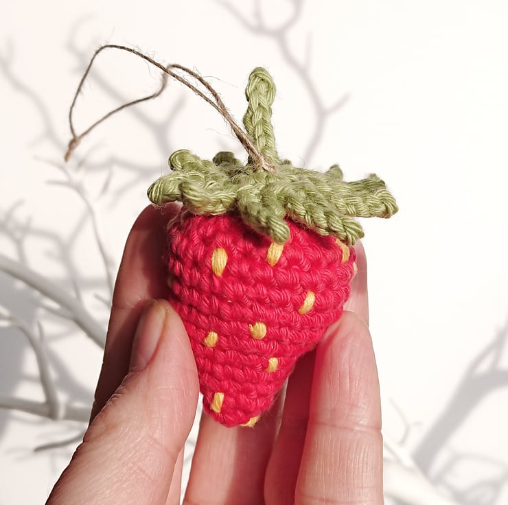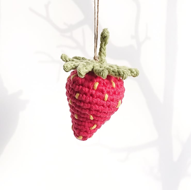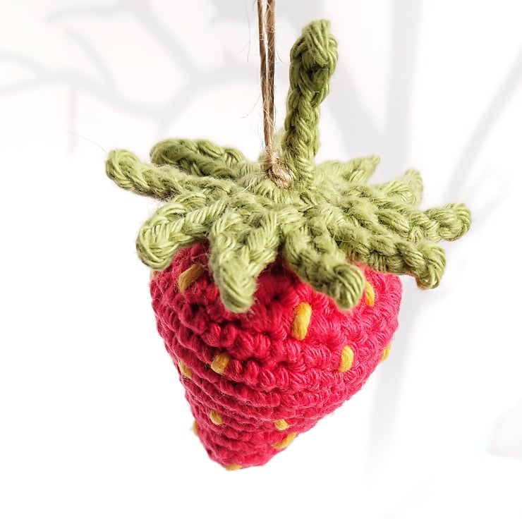 Amigurumi Crochet Strawberry Hanging Decoration to brighten your home for summer, hang in a window, or your car, or simply a lovely little keepsake gift.