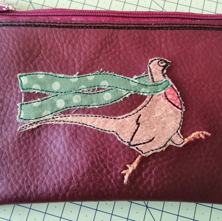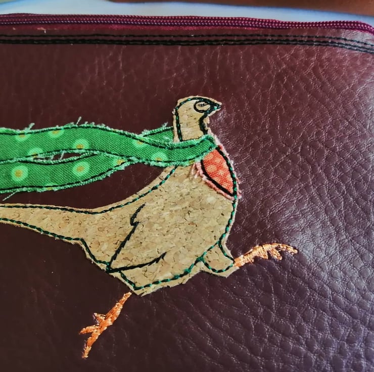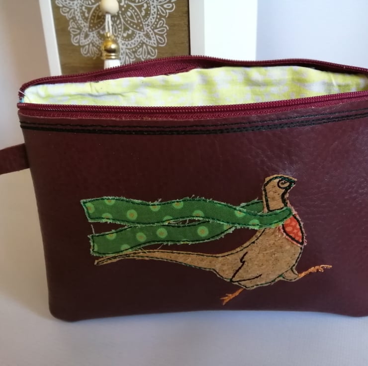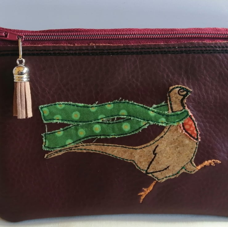 This fabulous lined leather clutch bag could have a number of uses. Perfect as a clutch and equally ideal for cosmetics, brushes, combs, craft items, to name a few. Made in a burgundy leather with a cute appliqued Pheasant on the front in cork and cotton. The bag has a zip closure with a tassel and a swivel clip on the side, making it ideal to carry attached to a belt etc. . If you need any more information please do not hesitate to contact me.