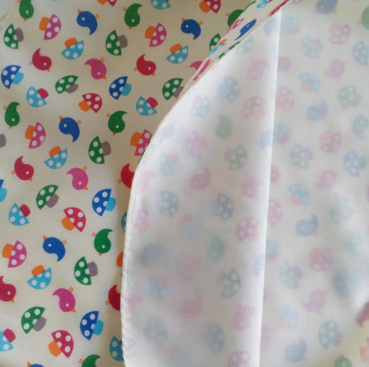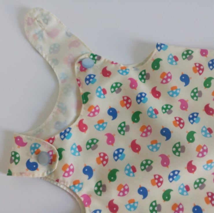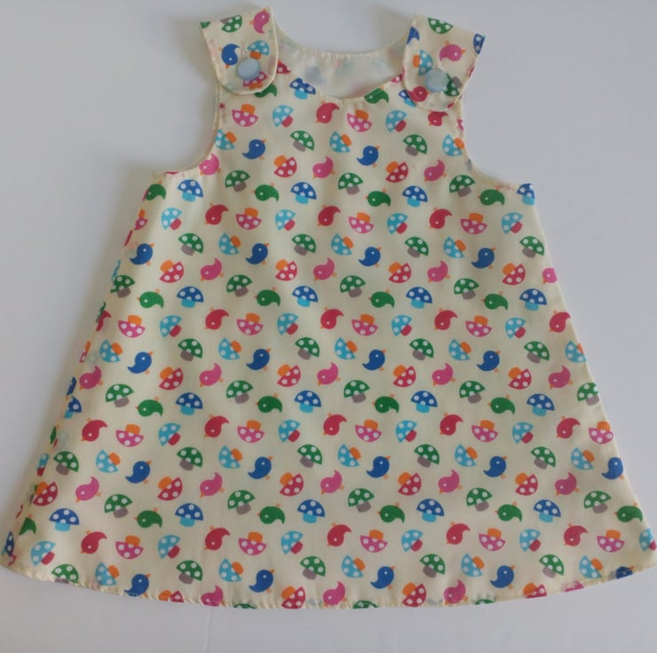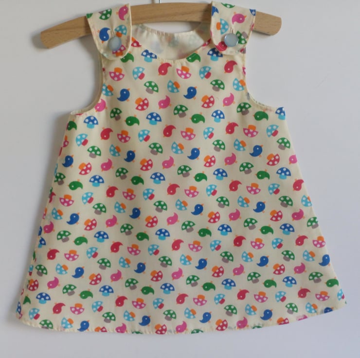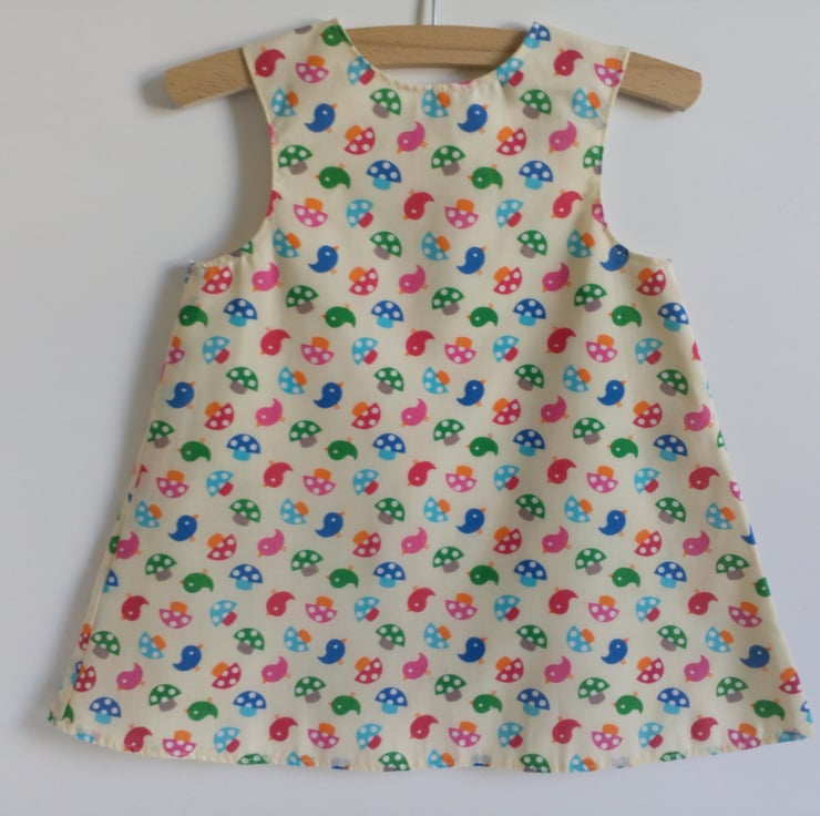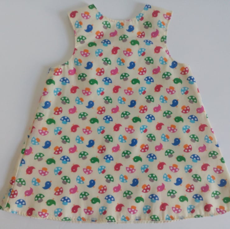 A line style dress/pinafore with a bird and toadstool design. Fully lined in cream polycotton.