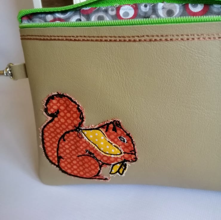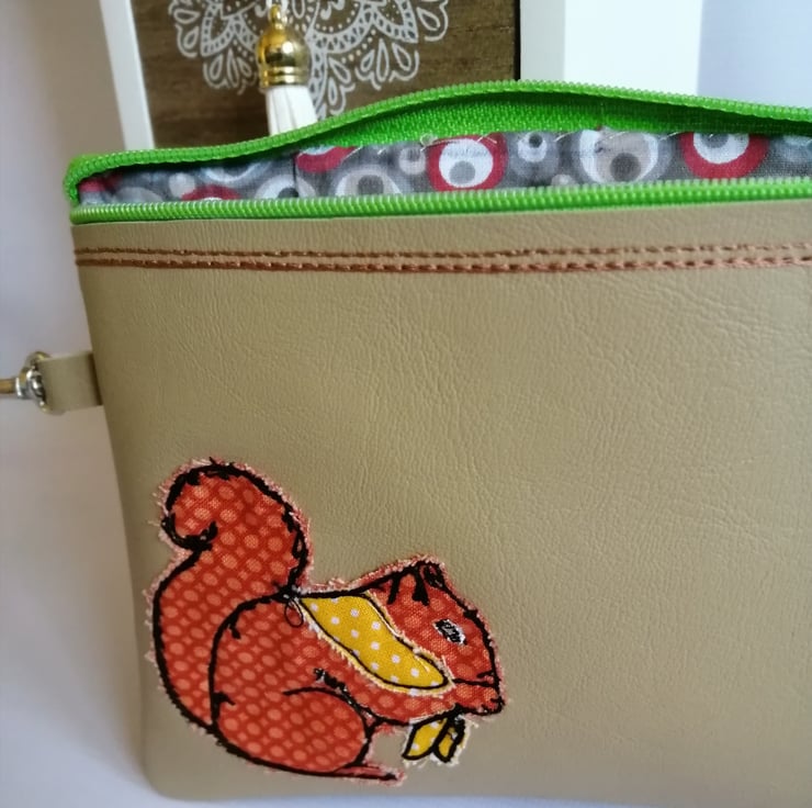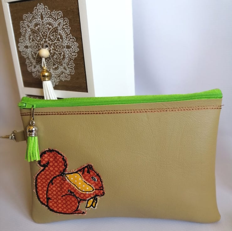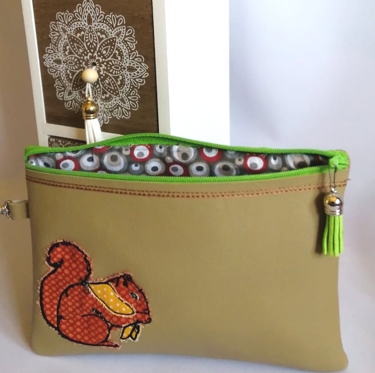 This fabulous lined leather clutch bag could have a number of uses. Perfect as a clutch and equally ideal for cosmetics, brushes, combs, craft items, to name a few. Made in a fawn coloured leather with a cute appliqued Squirrel on the front in cork and cotton. The bag has a zip closure with a tassel and a swivel clip on the side, making it ideal to carry attached to a belt etc. . If you need any more information please do not hesitate to contact me.