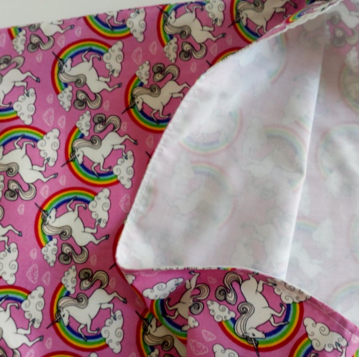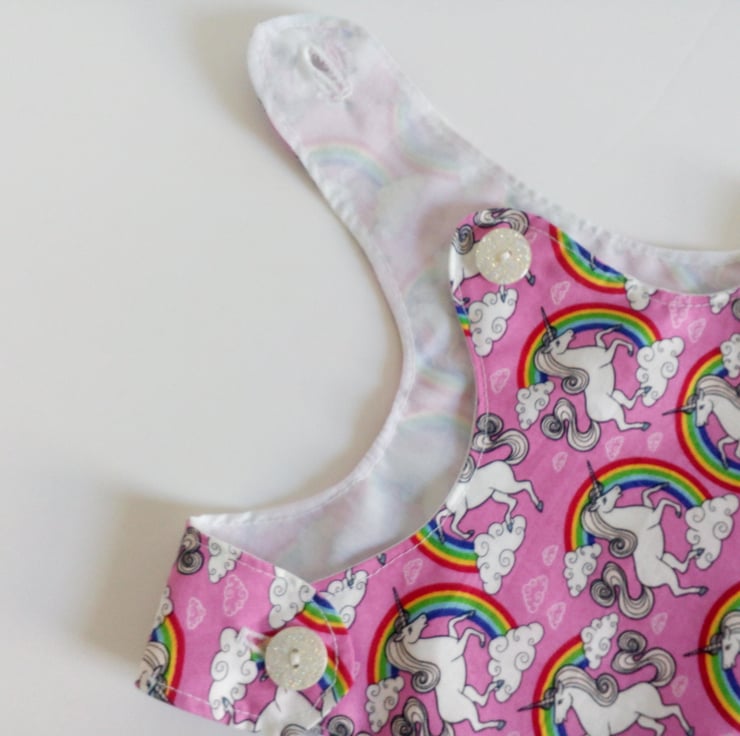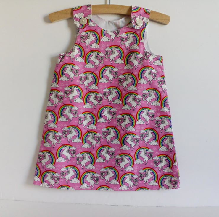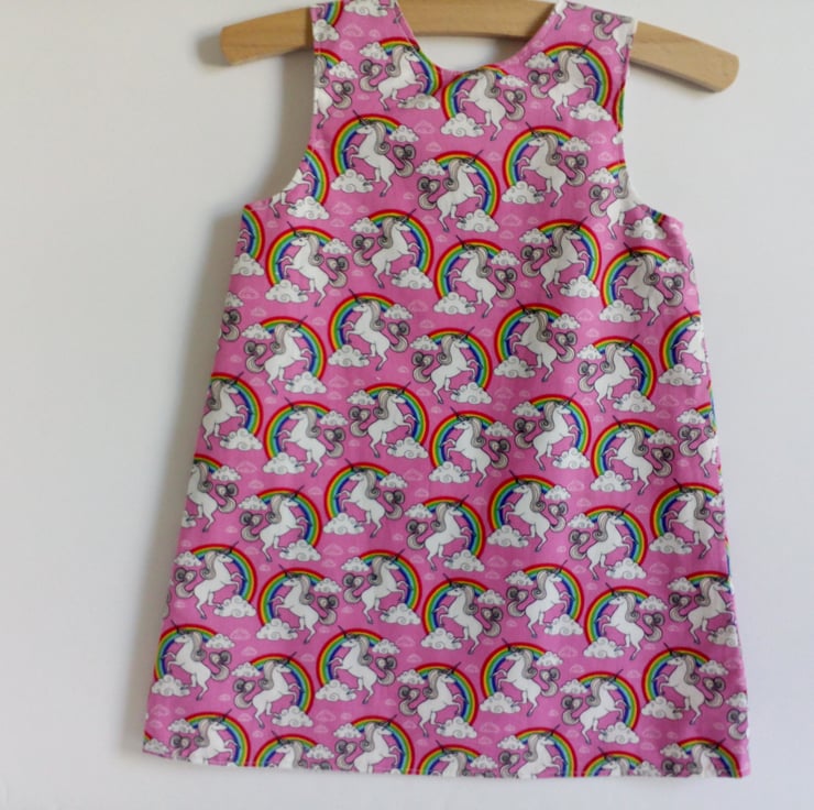A line style dress/pinafore in pink with unicorns. Fully lined in white polycotton