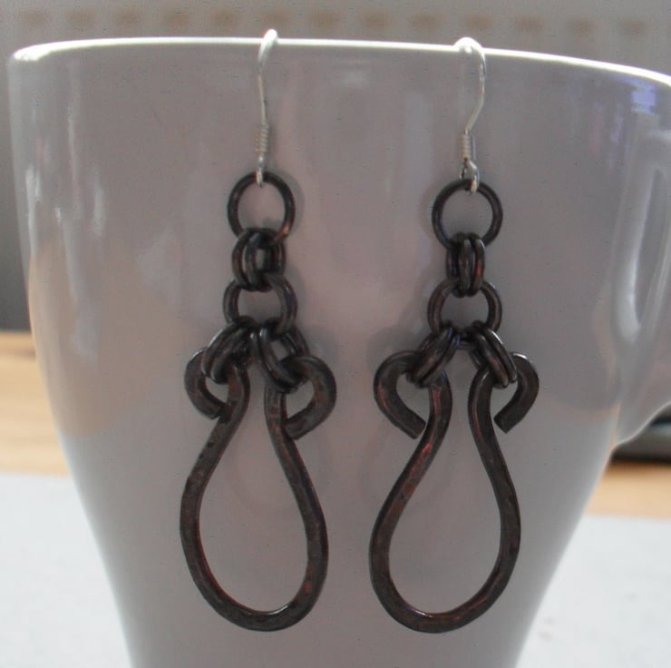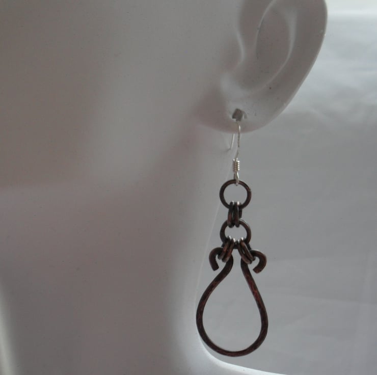 Copper earrings made with copper wire which has been shaped,hammered to give texture and has been oxidised to give an aged look.