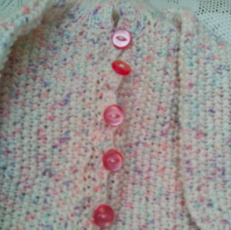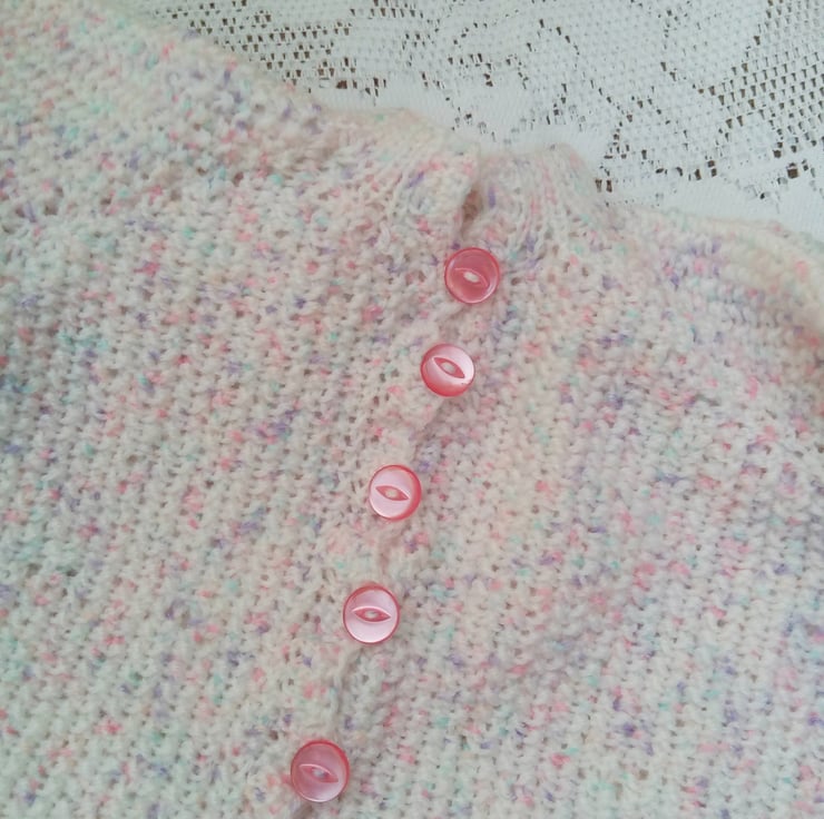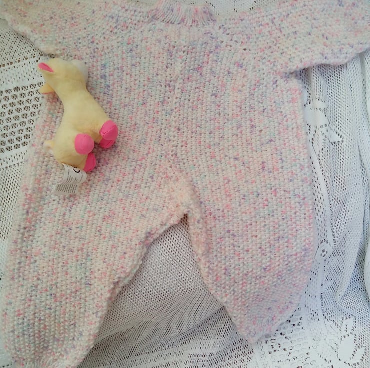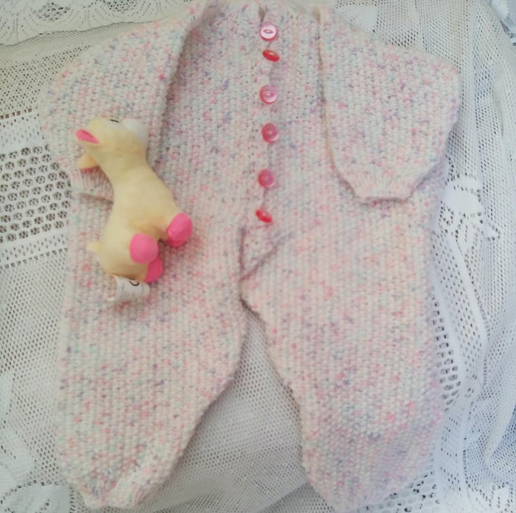 Cosy and Warm All in One Suit Hand Knitted in moss stitch with pink flecked double knitting weight yarn. It has buttons down the front to allow easy access to dressing baby. It would make an ideal gift for a new baby, a baby shower gift or a Christening gift, or a treat to keep your own little one warm.