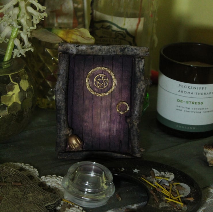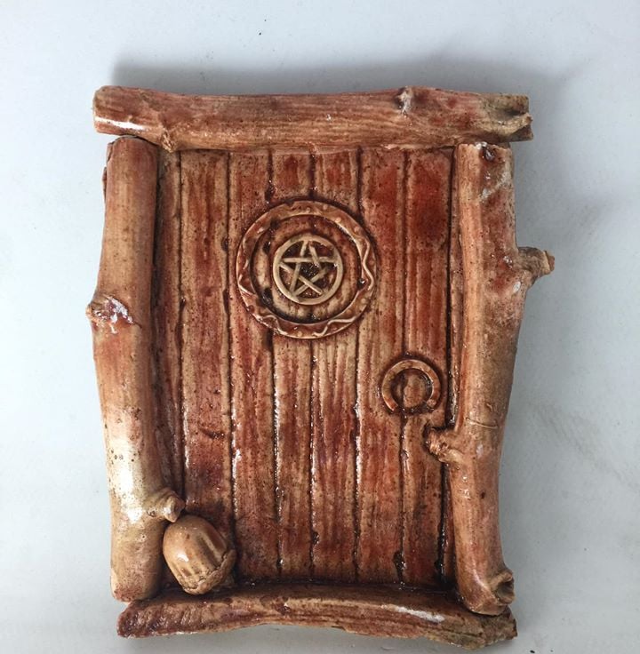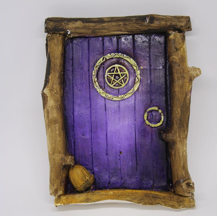 This door is embellished with a pentagram to let you know it is a witches door, with an acorn at the step.