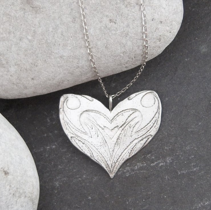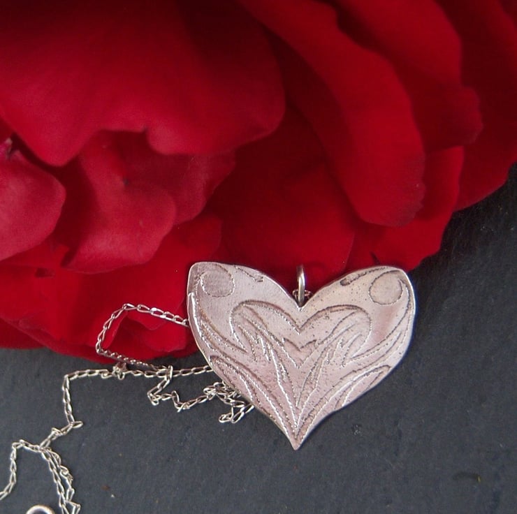 Heart pendant, cut from 0.8mm sterling silver sheet. Etching has given a slight rustic texture. Approximately 3 cms across.