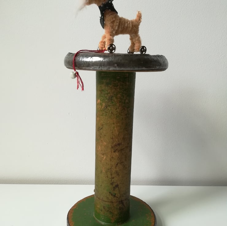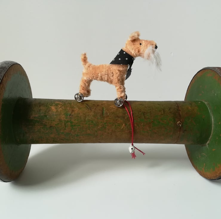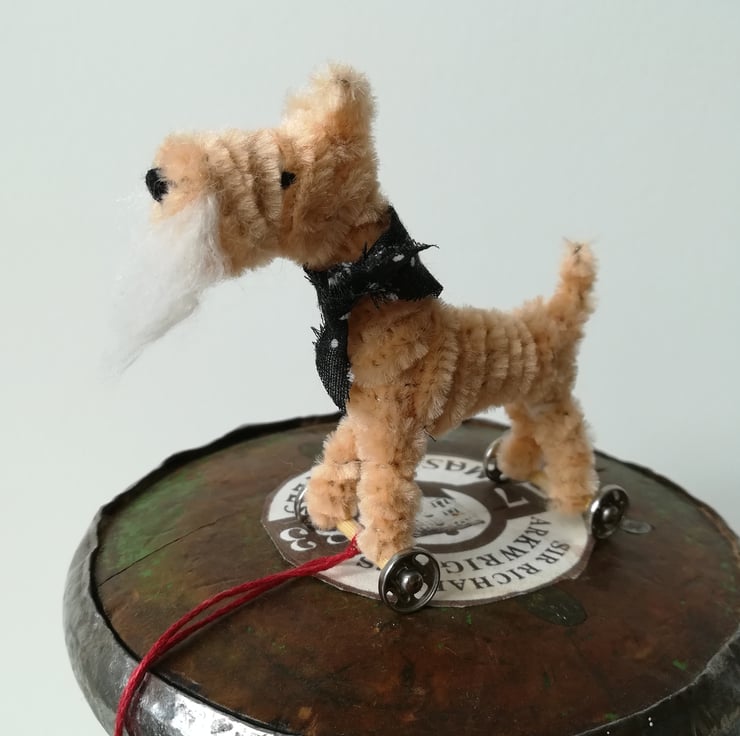 Miniature hand made OOAK terrier on wheels (not turning). Vintage styled hand sculpted from pipecleaners. This little fella is NOT a toy and is intended for display only. He is lovingly made in my workshop in Derbyshire. He comes in his own box.