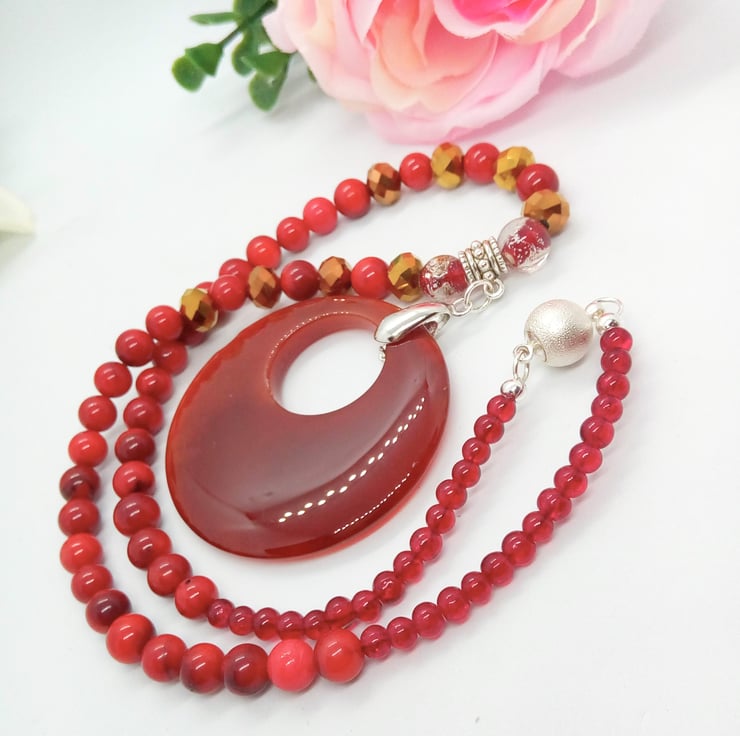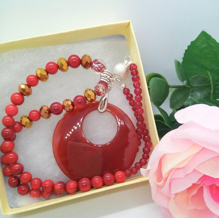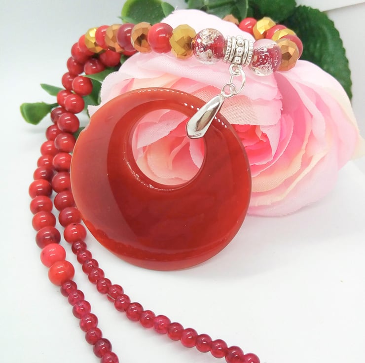 Deep rich red glass donut pendant necklace, which measures 50 mm from top to bottom is hung on a red beaded necklace made with 6mm and 8mm pressed coral beads, 8mm red crackle beads with silver inserts, 4mm red glass beads and 8mm x 6mm gold crystal rondelles beads. The necklace has a silver plated ball magnetic clasp and it is 18.5 inches (48cm) in length.