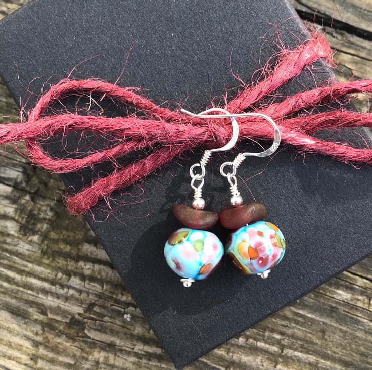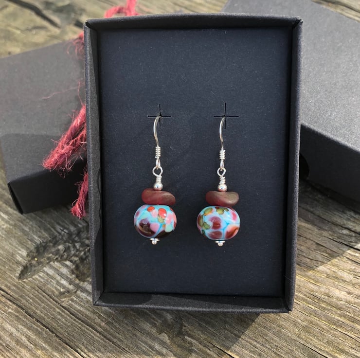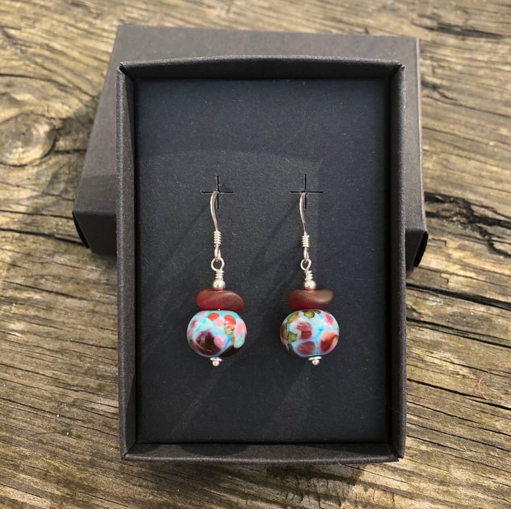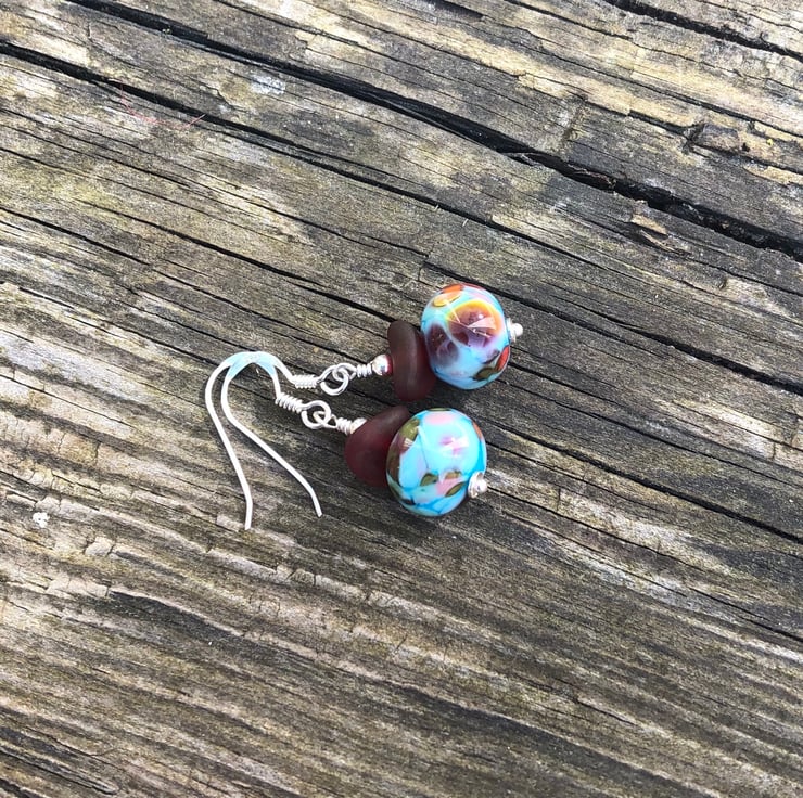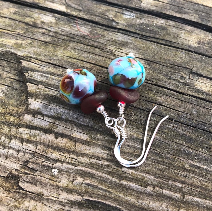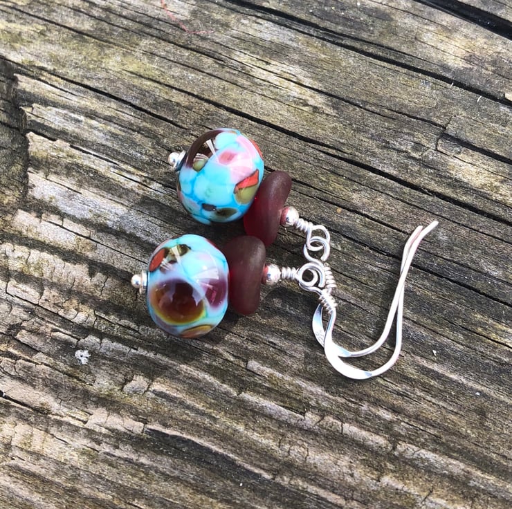 Turquoise & red mix lampwork beads imported from a talented glass artist from Canada has been teamed with frosted red Czech glass wave beads onto sterling silver.