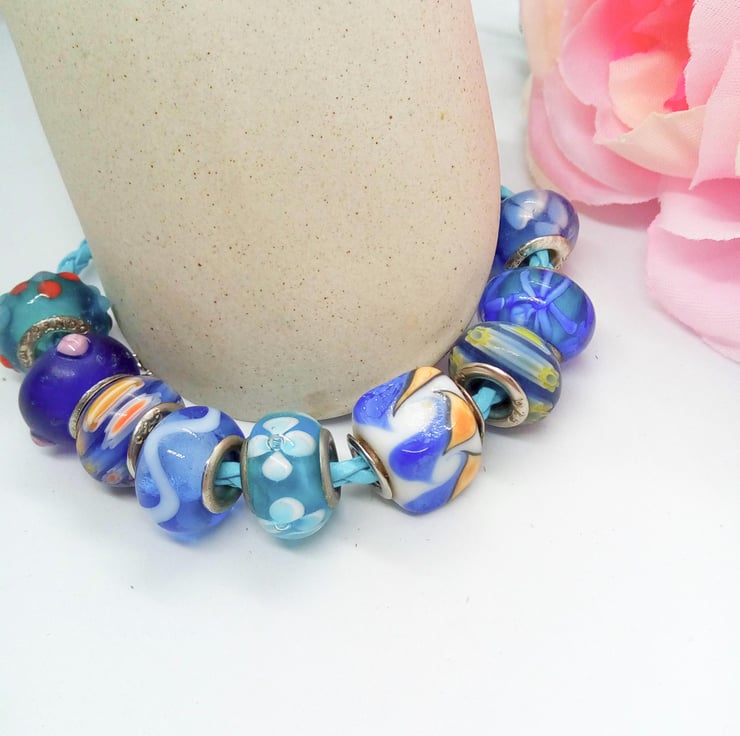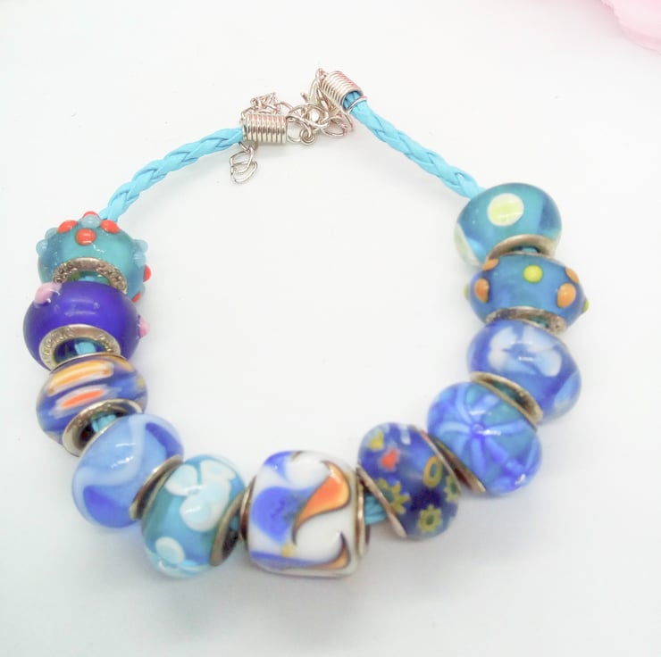 The bracelet is made using 15mm x 10mm different shades of blue large hole European lampwork beads and a square 10mm x 12mm large hole European lampwork bead all threaded onto a pale blue plaited leather bracelet. The Bracelet is 8 inches (20cms) in circumference and has a silver plated lobster clasp.