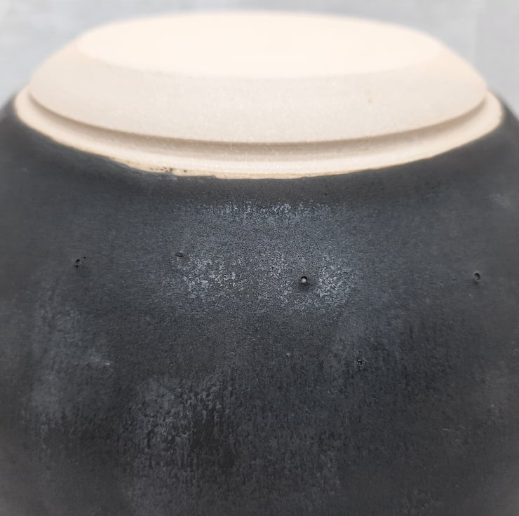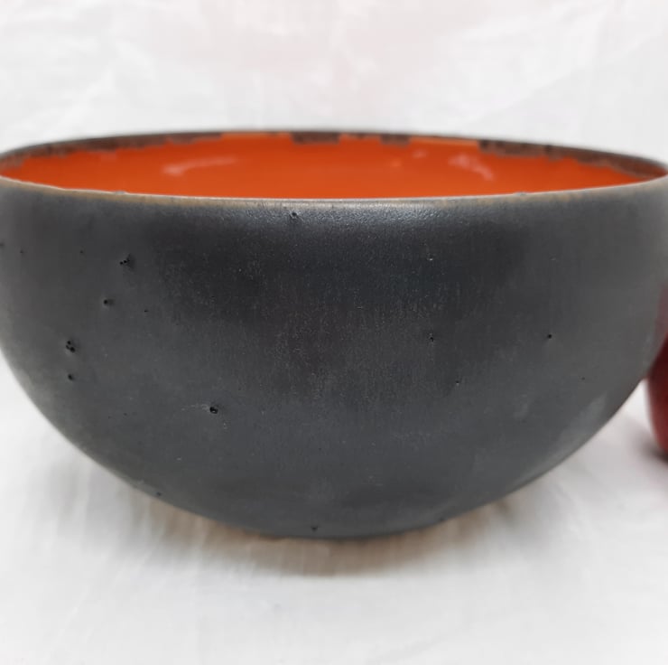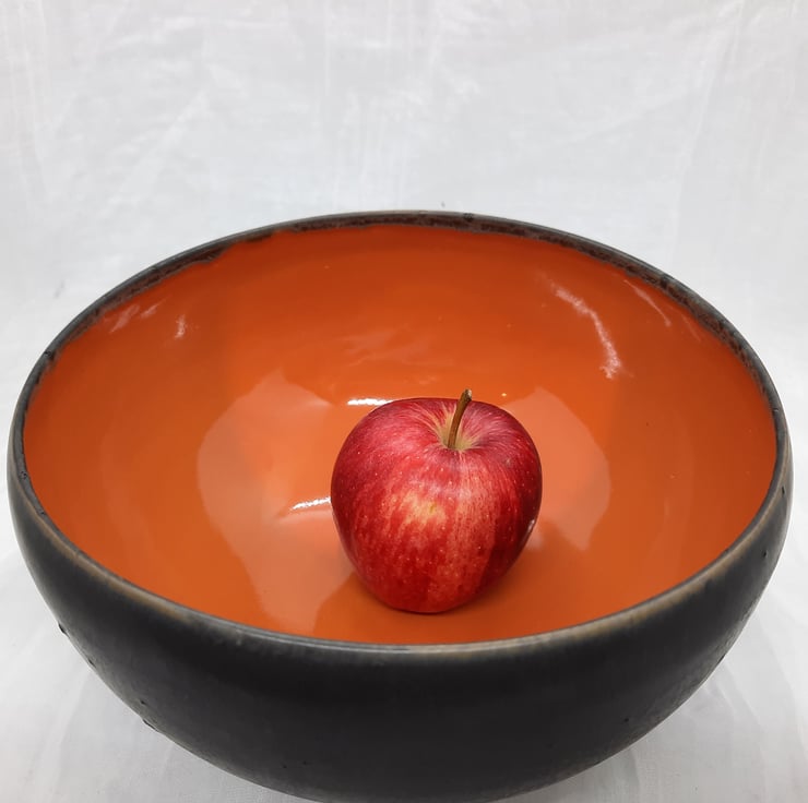 A medium sized rounded ceramic bowl. There is a glossy burnt orange glaze on the inside with a dark shino glaze on the outside. Shino glaze has a matt with a slight sheen textured bubbled surface in places.