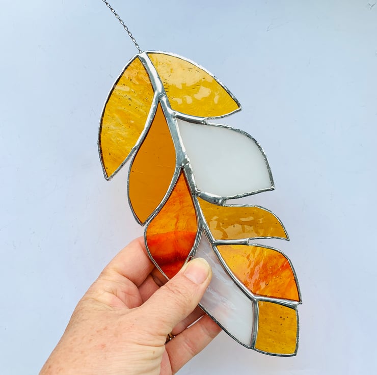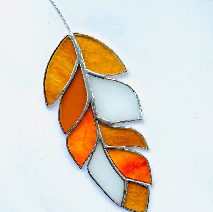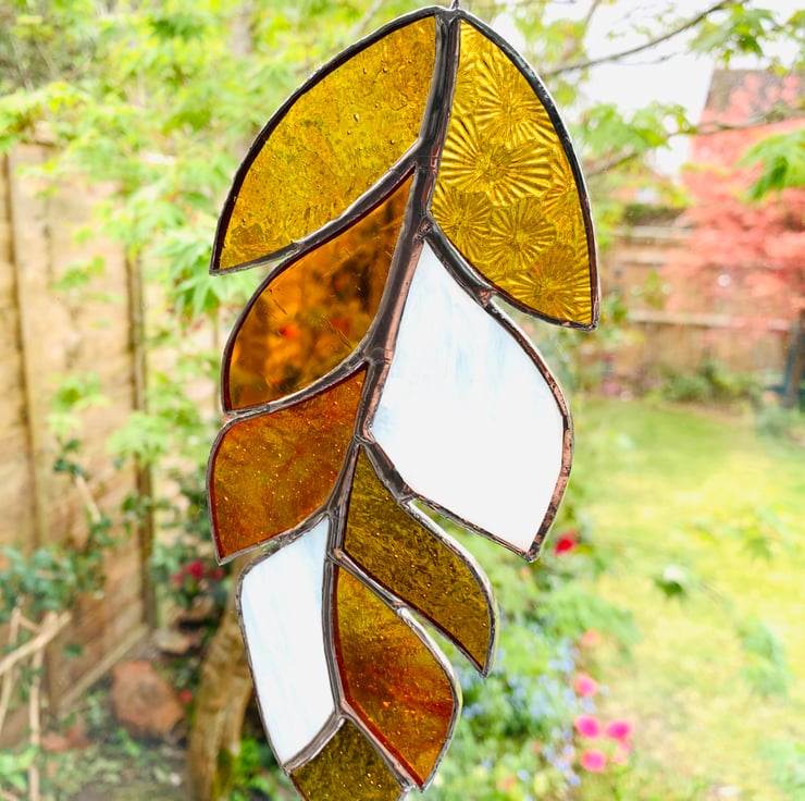 The glass used in this suncatcher is red streaky wissmach glass, amber florentine glass, amber textured glass and white streaky sea glass.
