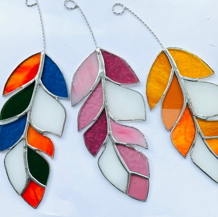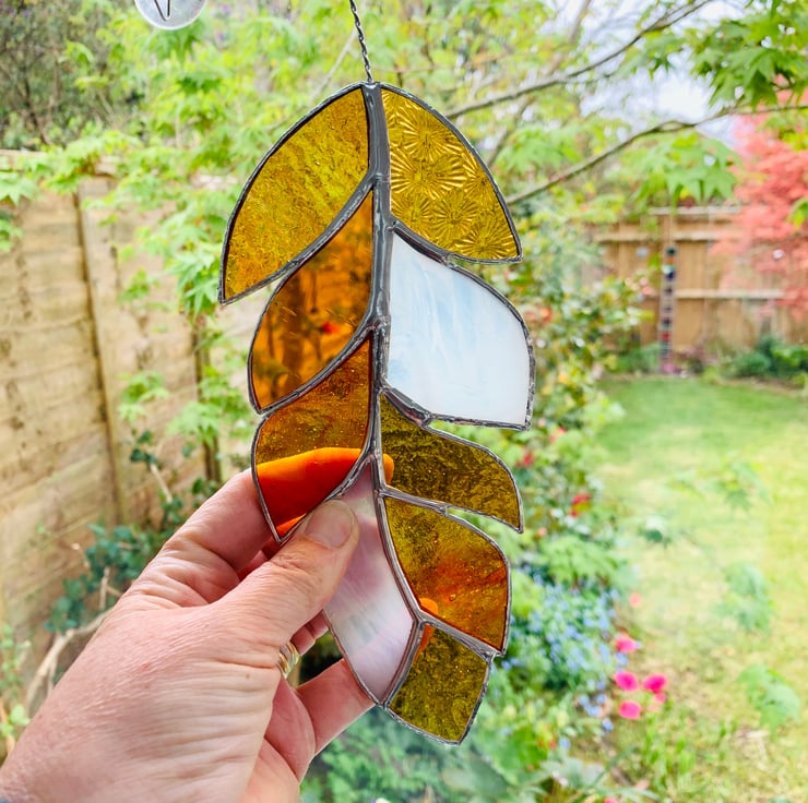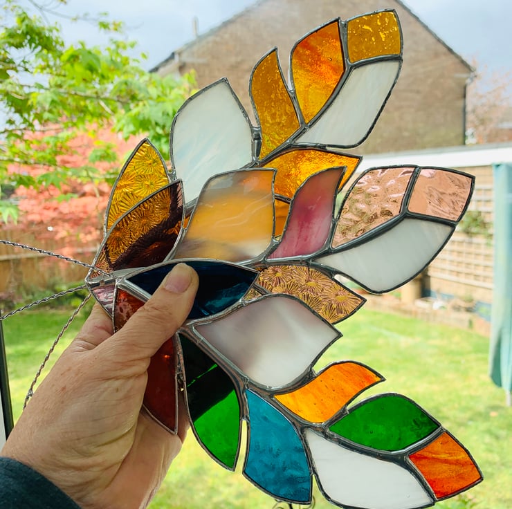 The Suncatcher measures 20cms x 9cms excluding the wire hanger and 28cms long including the hanger.