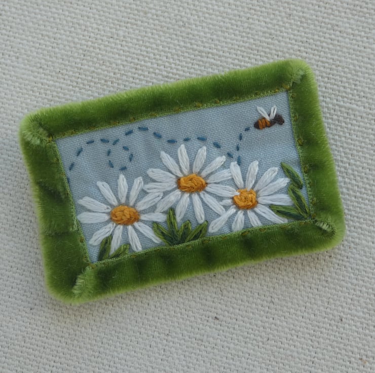 Hand embroidered brooch featuring three daisies and a busy bee....