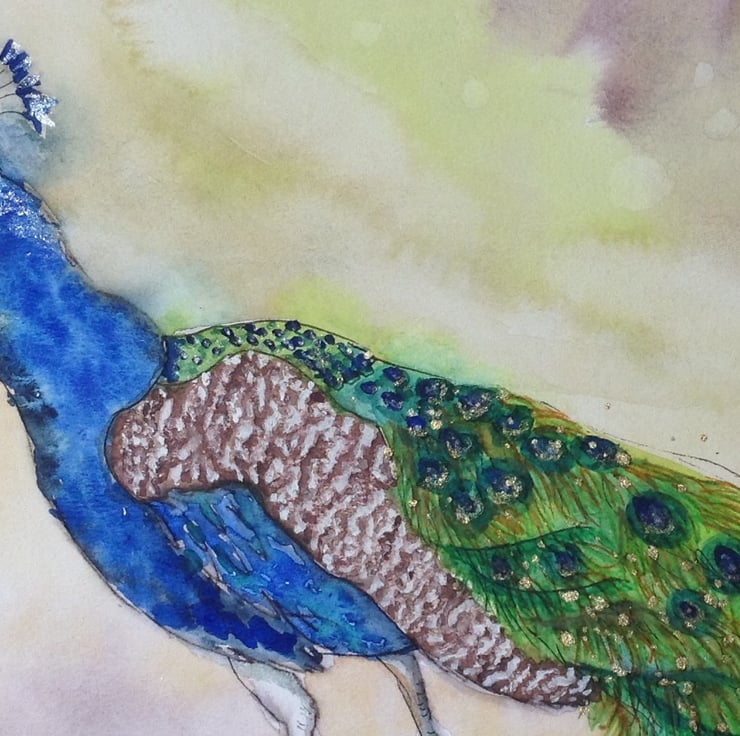 Loose style painting of a colourful peacock, using watercolour, ink and gold metallic paint. Painted on a sturdy mixed media art board, it can be framed with or without a mount as shown in the photos. Size is 29.5 x 21cms (11 1/2" x 8 1/4") approx.