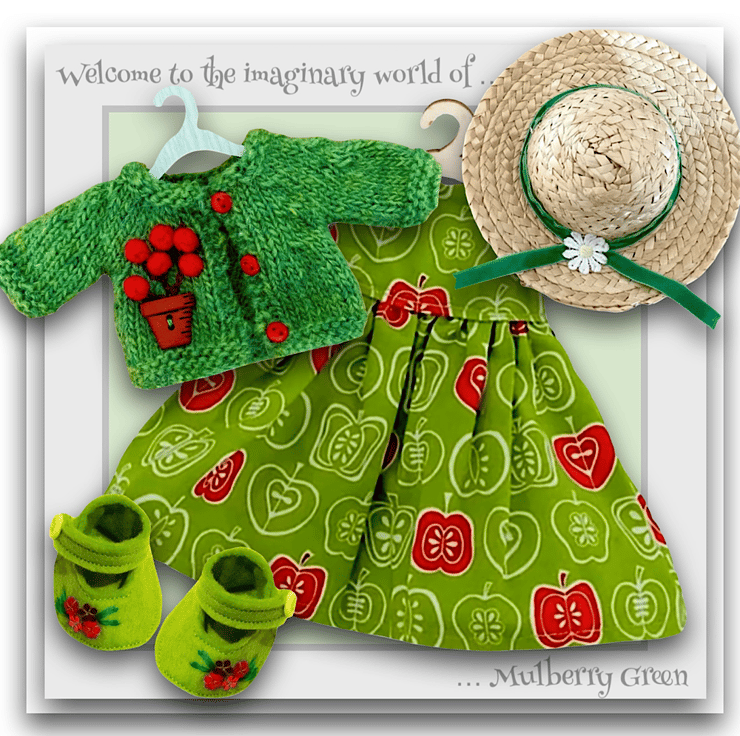 A lovely fresh apple print dress to fit the Mulberry Green characters. The dress has a full skirt and a lined bodice.
