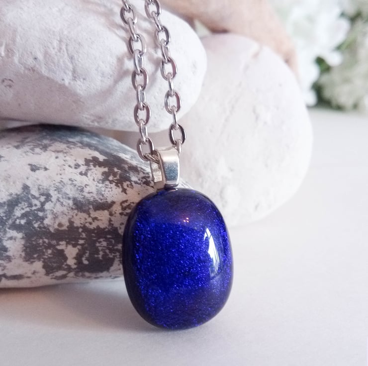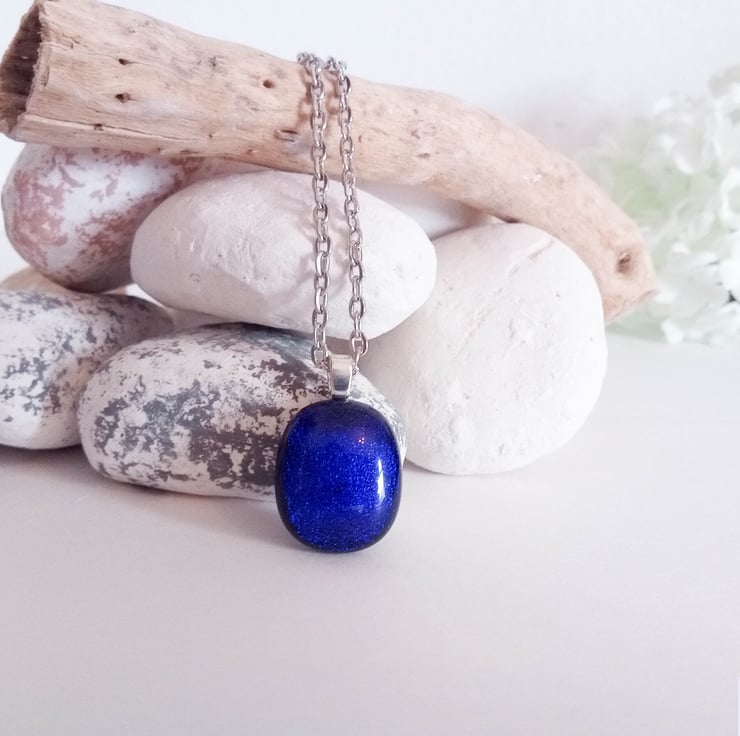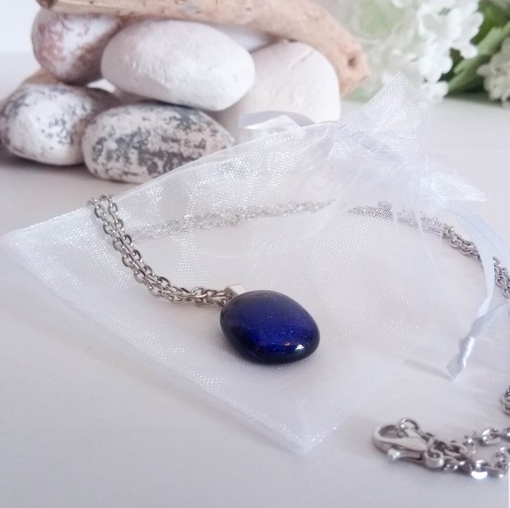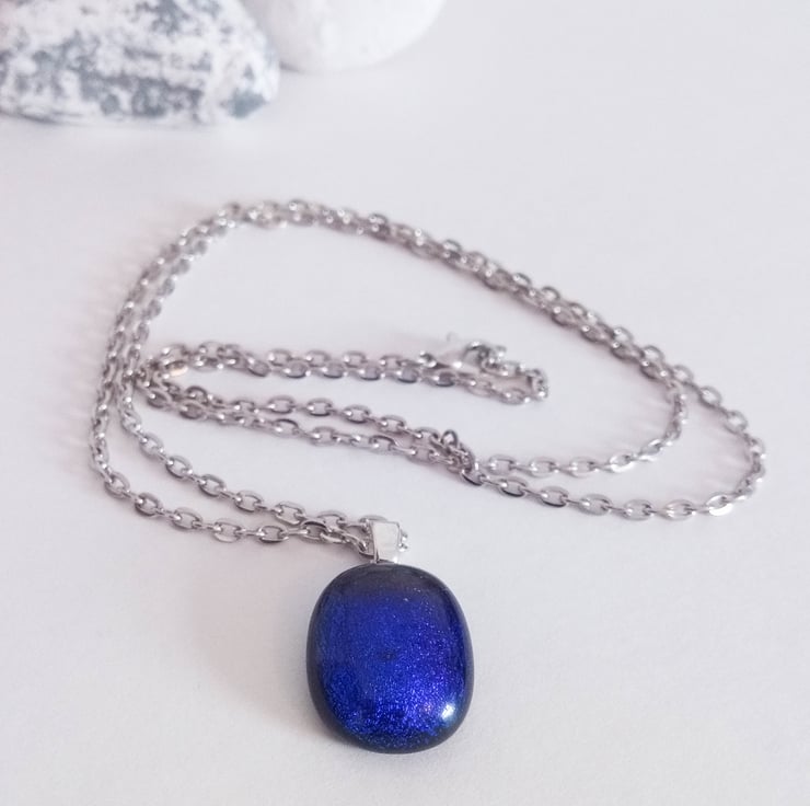 This glass pendant displays different colours when viewed from different angles; it shows shimmering shades of blue. It glistens in the sunlight, making it an eye-catching piece of jewellery.
