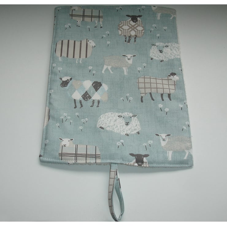 2 x Mats Featuring Sheep in patterns of tartan and stripes in Grey and Cream on a Duck Egg Blue Background.