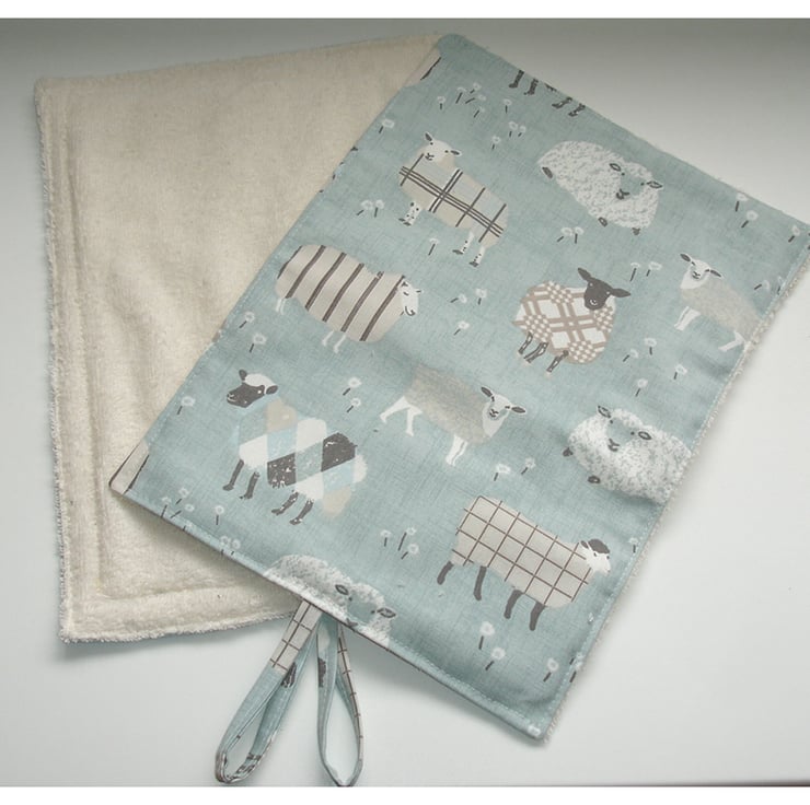 2 x Mats Featuring Sheep in patterns of tartan and stripes in Grey and Cream on a Duck Egg Blue Background.