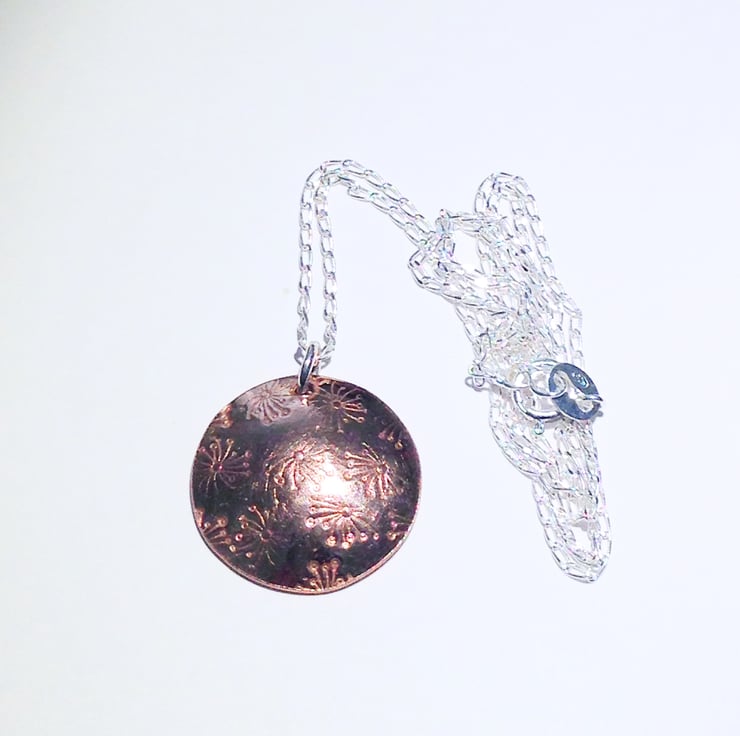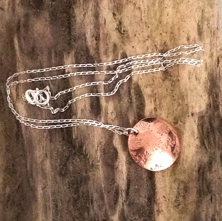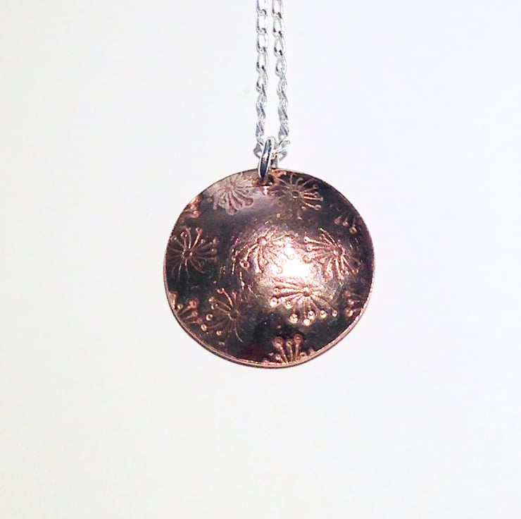This beautiful pendant necklace has been handmade from copper which has been given an attractive organic stamped pattern and domed to create an interesting shape. The pendant has been polished to a high shine.
