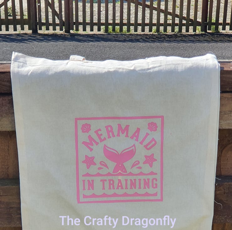 Cotton Tote bag with vinyl logo, "Mermaid in Training" in Pink. The tote bag measures approximately 40cm long by 37cm wide and is machine washable on 30 degree wash or hand wash in warm, soapy water. Iron on reverse side.