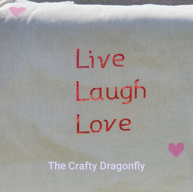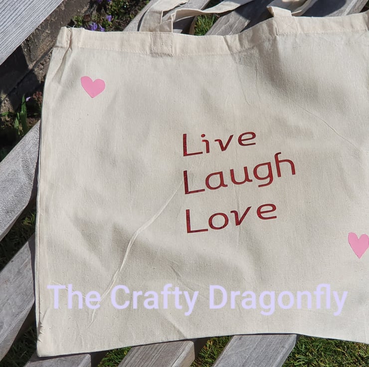 Cotton tote bag with "Live, Laugh, Love logo in red vinyl with two small pink hearts. The bag measures approximately 40cm long x 37cm wide excluding the handles. Machine washable to 30 degrees C or hand wash in warm, soapy water. Iron on reverse.