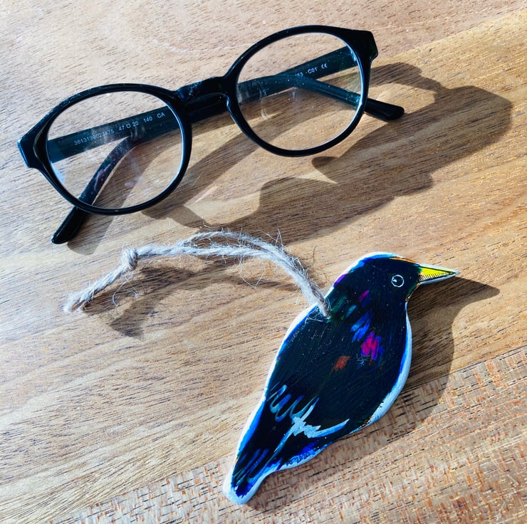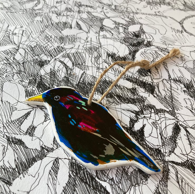 Little wooden hanging starling decoration. I love every part of the process from cutting out to the final coat of varnish. Although my favourite part is painting with acrylic inks and adding the detail to try and give each little bird it's own character.