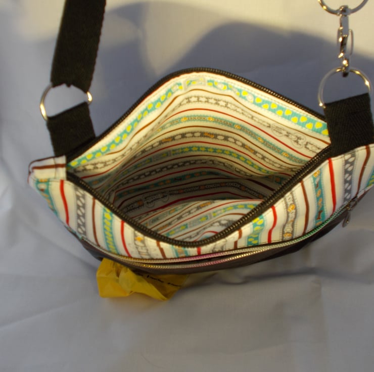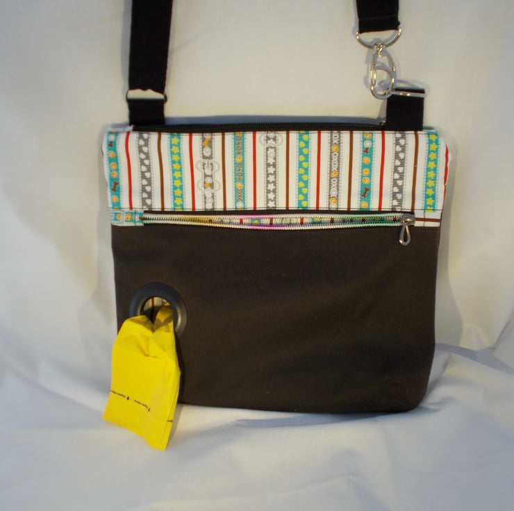 Perfect for walking to carry purse, phone and essentials plus integral hole for the 'poo' bags