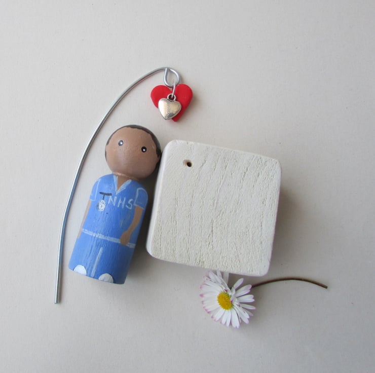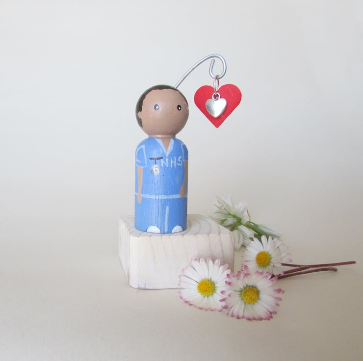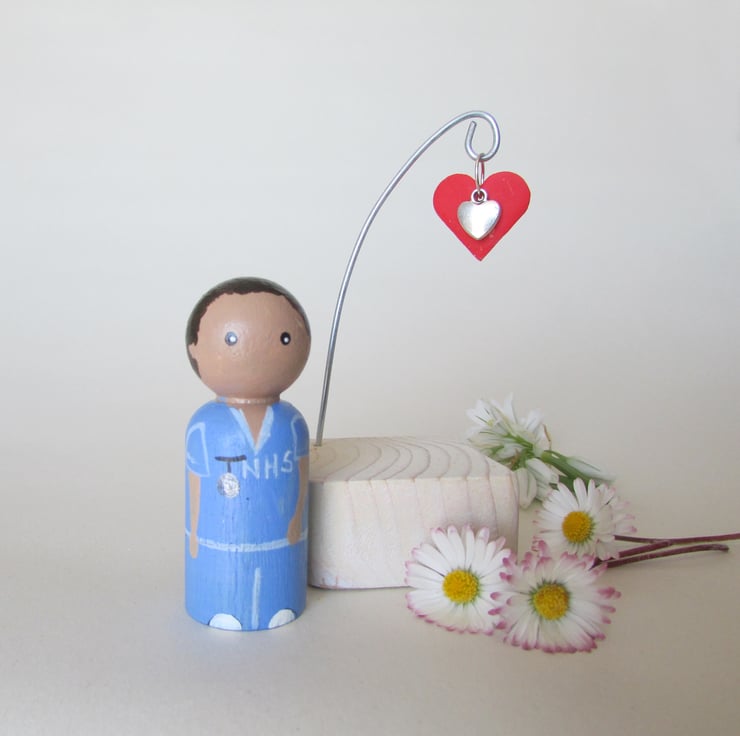 The painted details are of a male nurse or carer. He has a watch and NHS on his scrubs and is stood on a base that has a heart hanging from a wire hook.