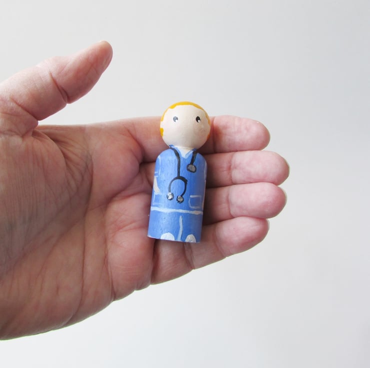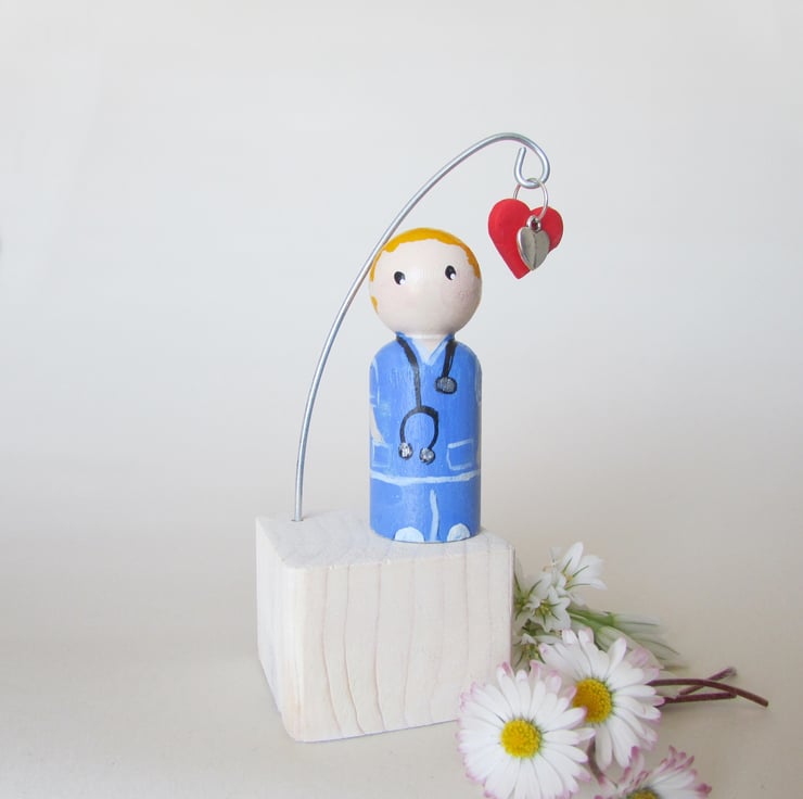 The painted details are of a male nurse or carer. He has a stethoscope around his neck. He is stood on a base that has a heart hanging from a wire hook.
