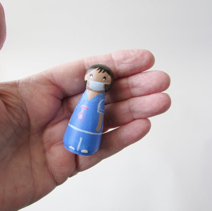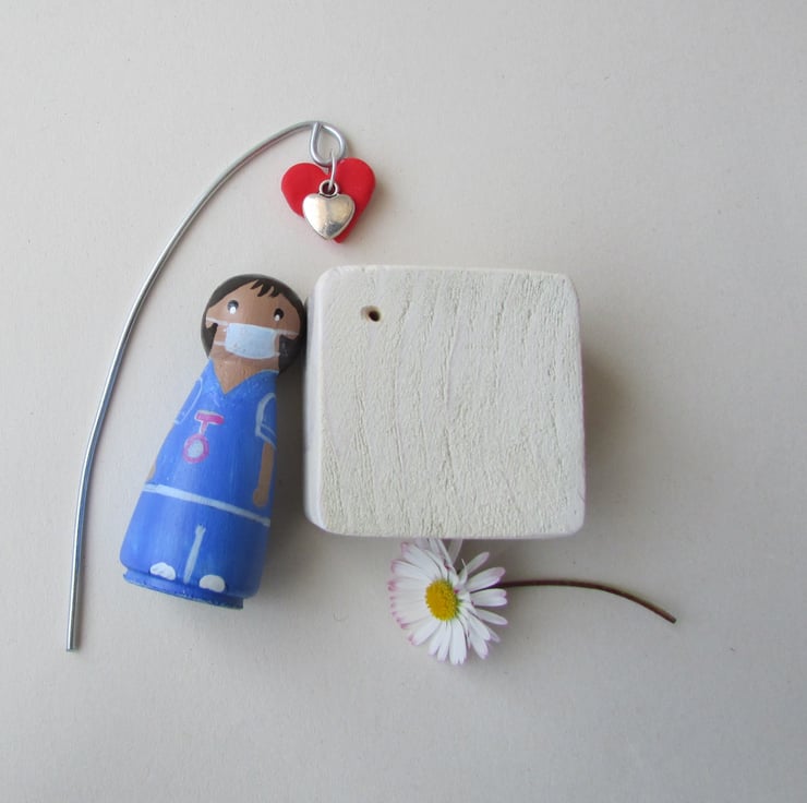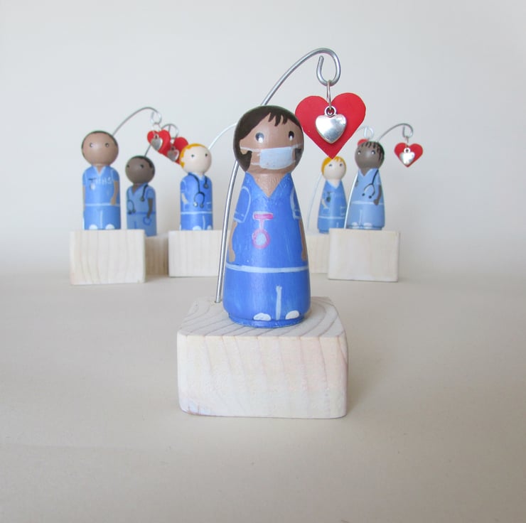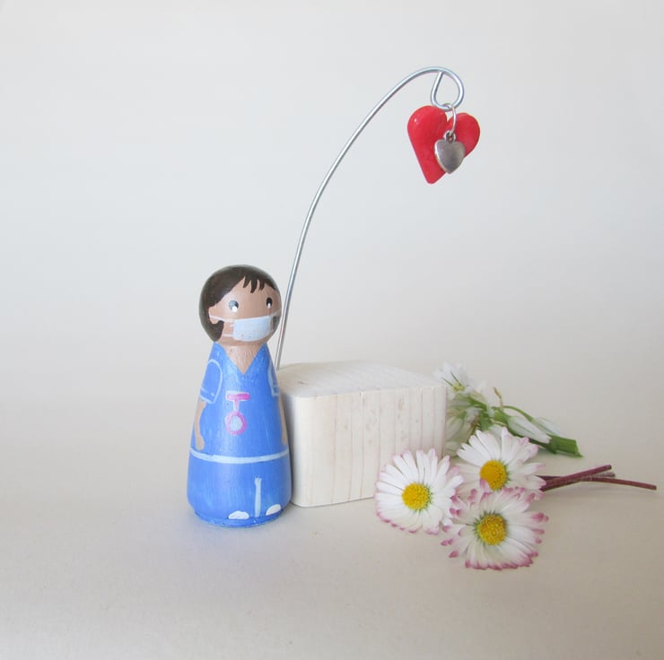 The painted details are of a female nurse or carer. This nurse is wearing a surgical mask and a pink watch on her scrubs. She is stood on a base that has a heart hanging from a wire hook.