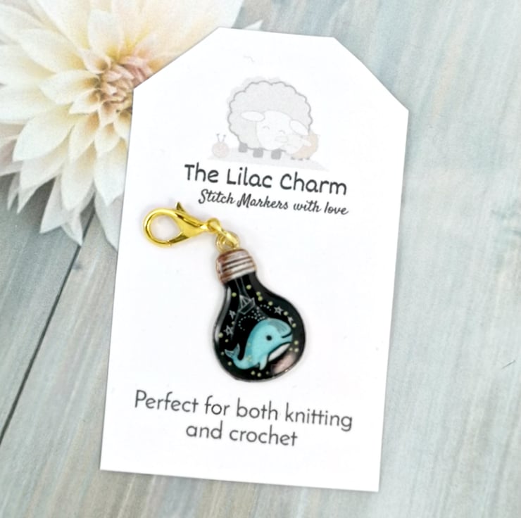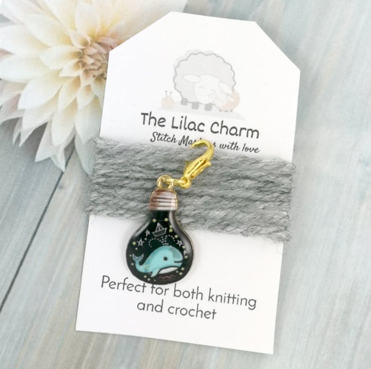 Gorgeous whale charm stitch marker. The charm has a detailed night time ocean scene...complete with sail boats, stars and an adorable whale. Perfect for knitting and crochet.