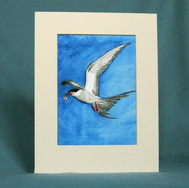 Watercolour painting, 11.2 x 15.8 cm. Supplied window mounted, overall matte size 17.8 x 22.9 cm (7 x 9in). Will fit a standard size frame.