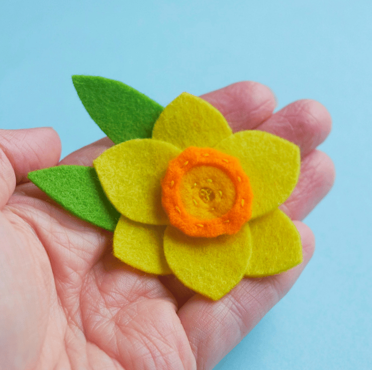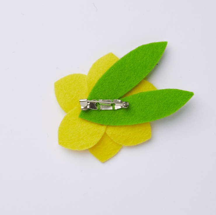 This vibrant daffodil pin brooch has been hand cut and hand sewn using layers of 100% wool felt and embroidered in the centre. It has a bright orange centre and it backed onto two nice green leaves. Perfect to add a pop of colour to wherever you choose to pin it! It has a simple silver coloured metal, brooch back.