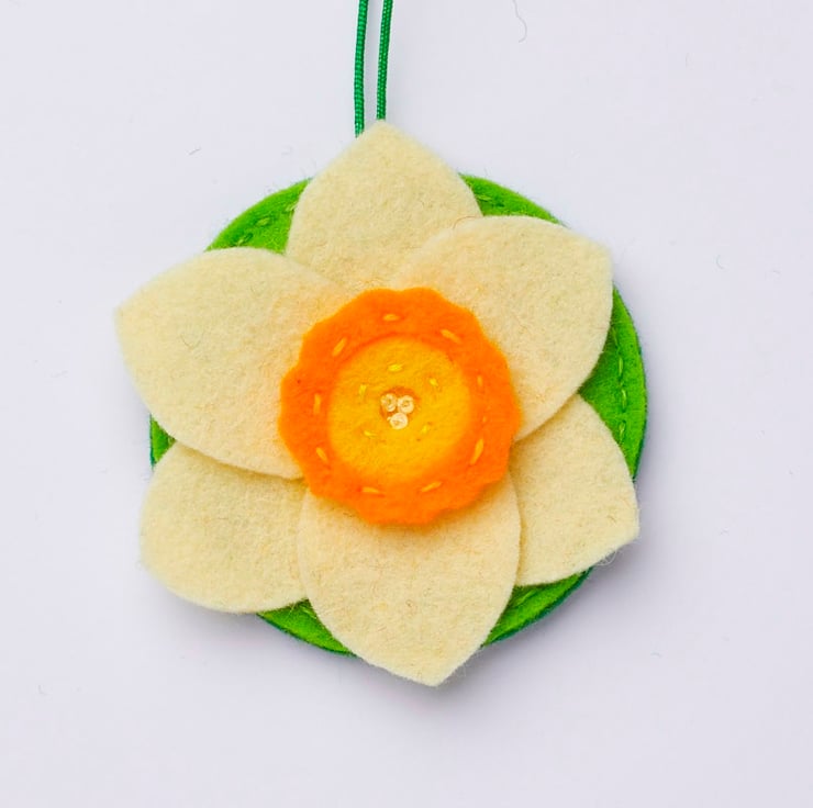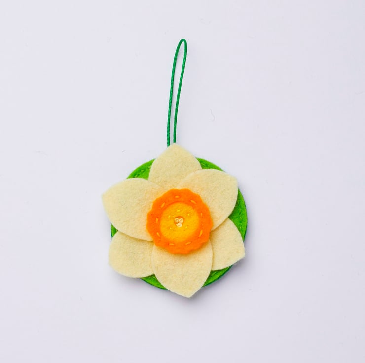 This pretty Narcissus daffodil hanging decoration has been hand cut and hand sewn using layers of 100% wool felt and embroidered in the centre with tiny french knots. It has a bright orange centre and it backed onto a circle of green felt. Perfect to add a sunny pop of colour to wherever you choose to hang it! It hangs from a green cord loop.